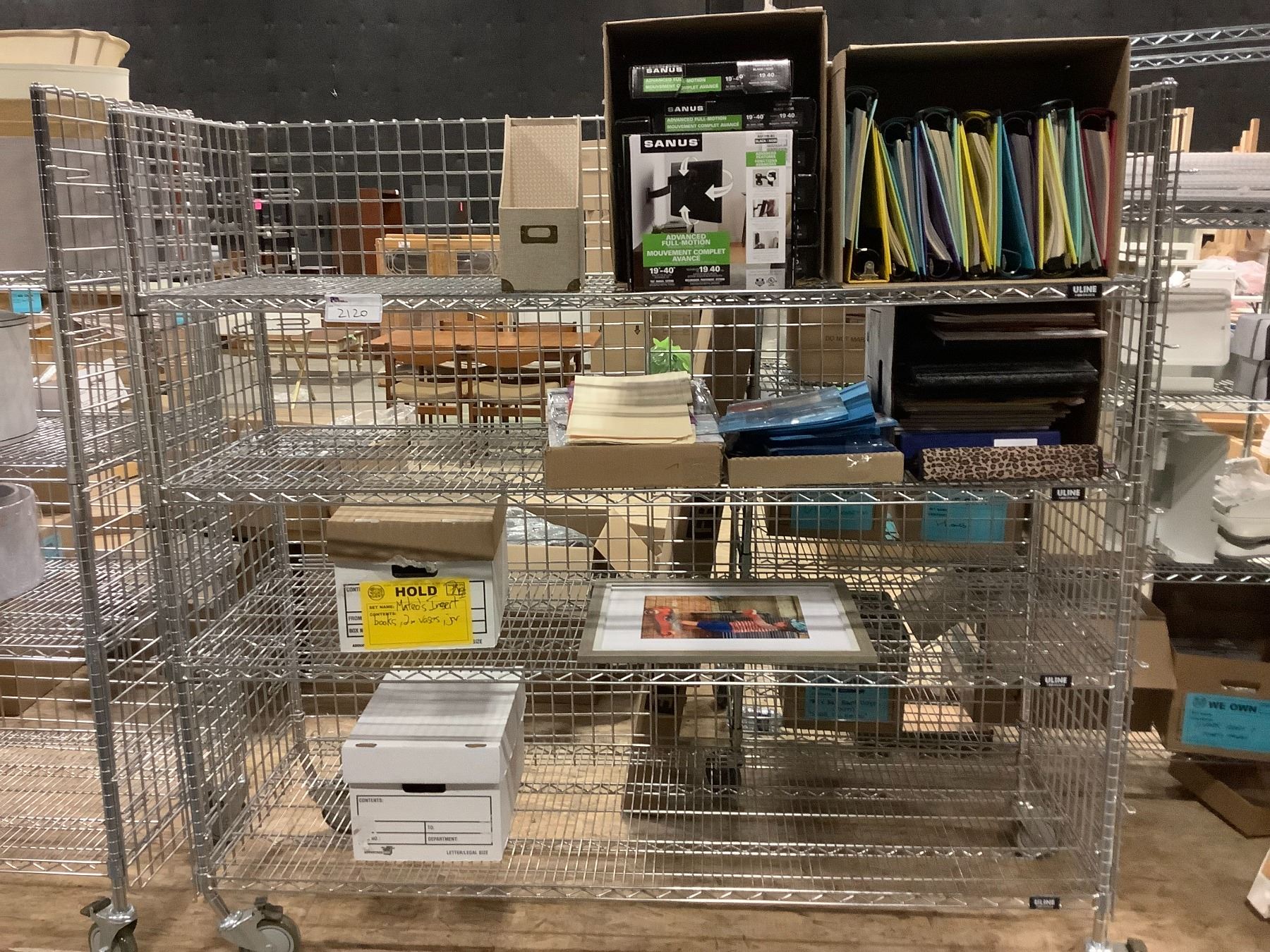 ROLLING METAL RACK WITH TV WALL MOUNTS, BOOKS, BINDERS