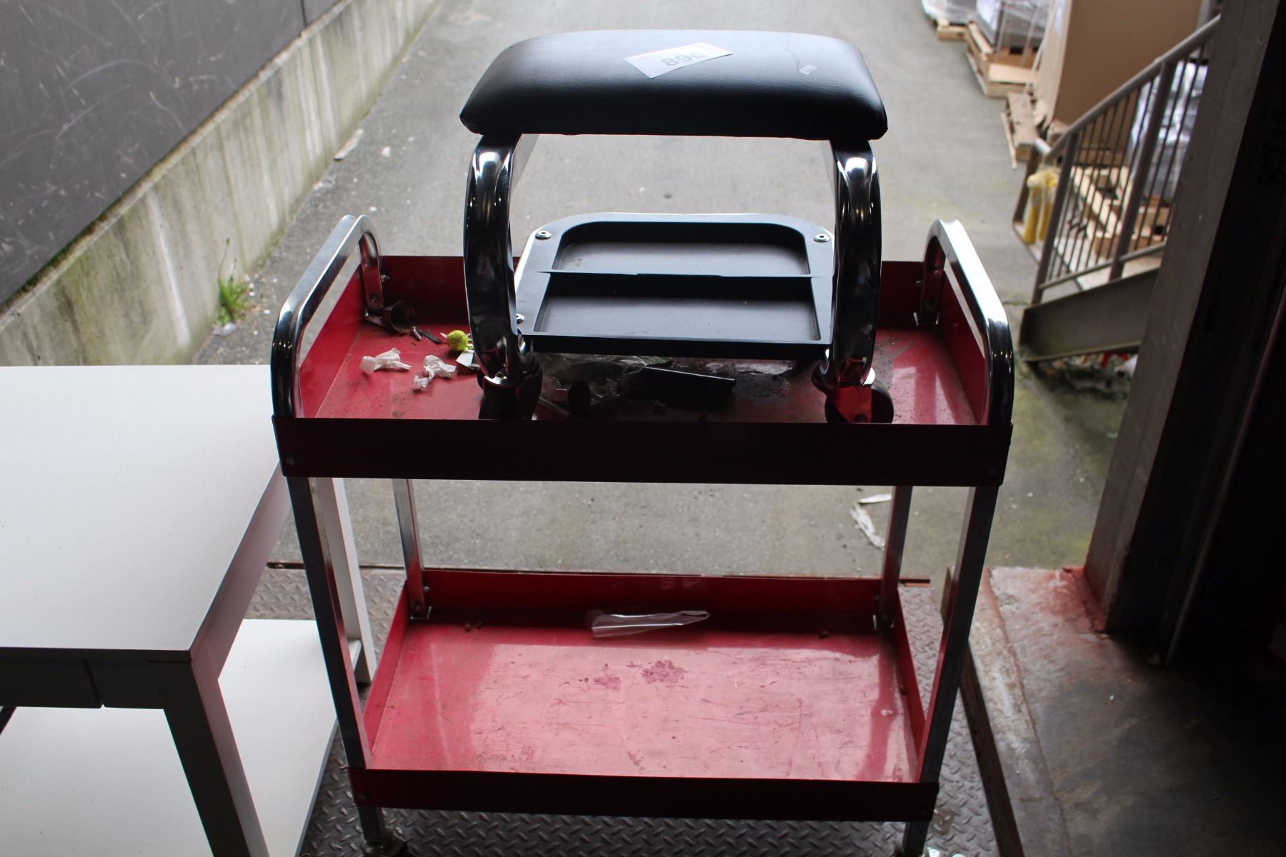 ROLLING METAL TOOL TRAYS AND PADDED SEAT ON WHEELS