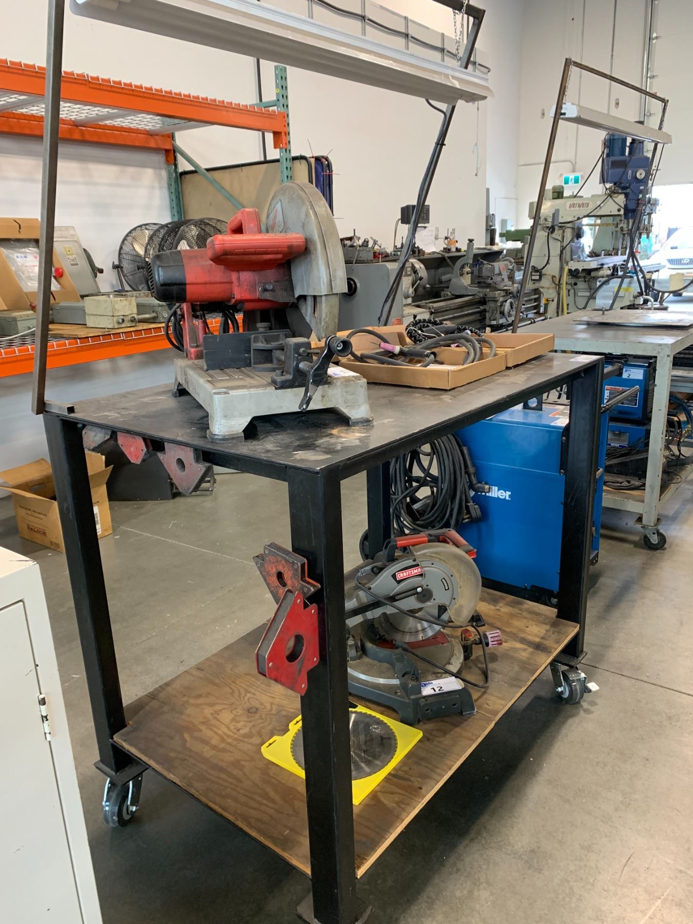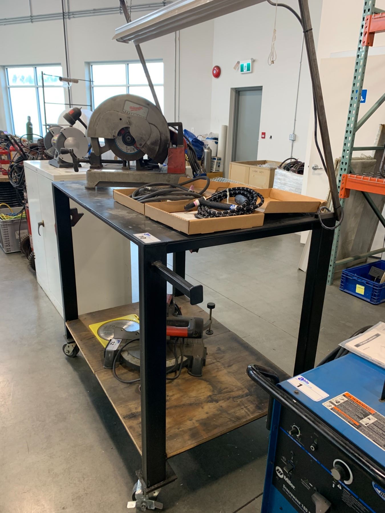ROLLING METAL WELDERS WORK TABLE W/OVERHEAD LIGHT - APPROX. 4FT ACROSS X 2 1/2FT WIDE X 3 1/2FT HIGH