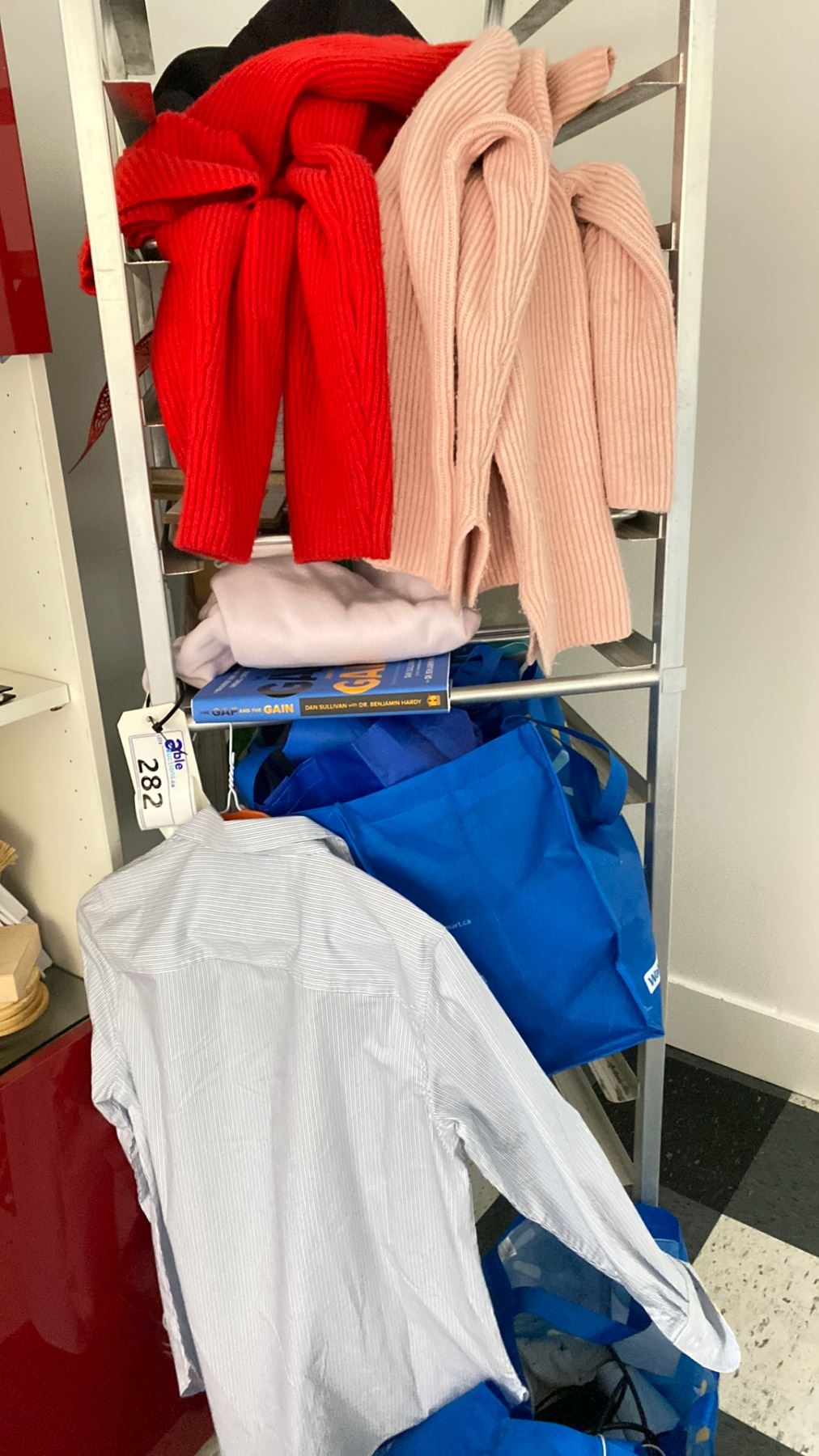 ROLLING RACK AND CONTENTS. CLOTHING, BOOKS, MISC ITEMS