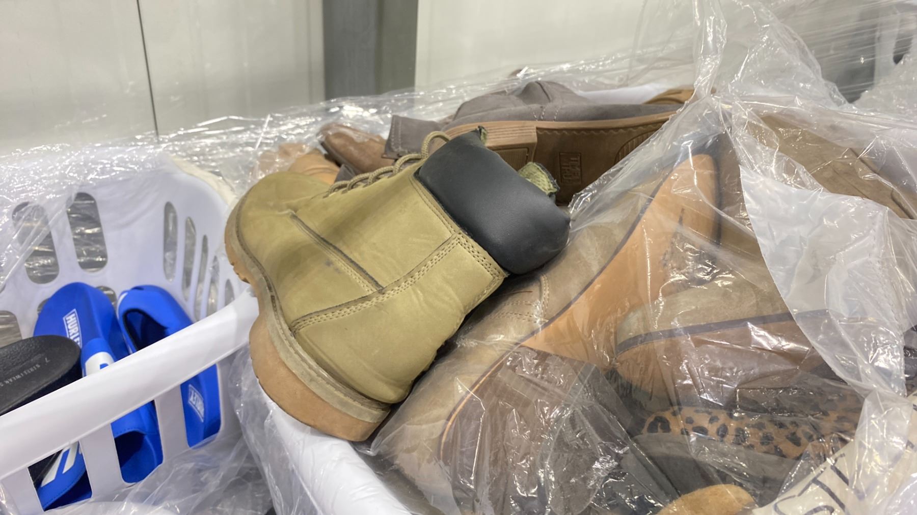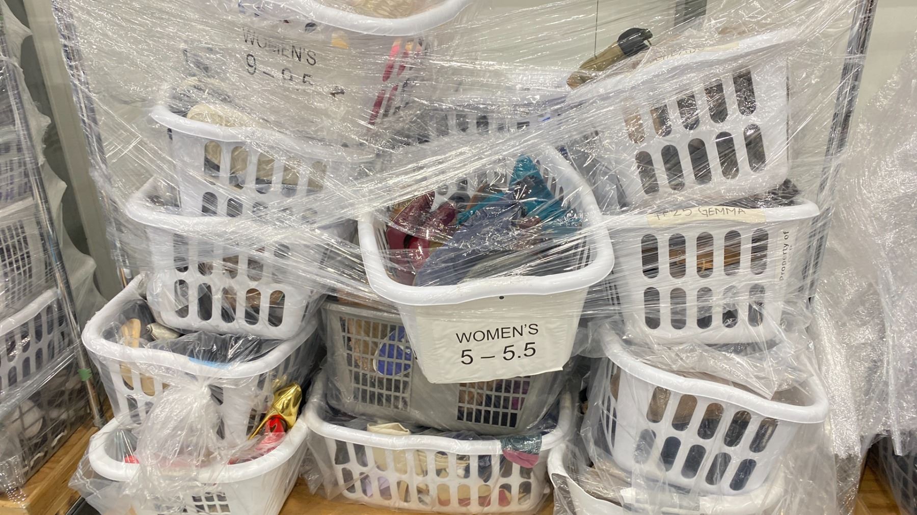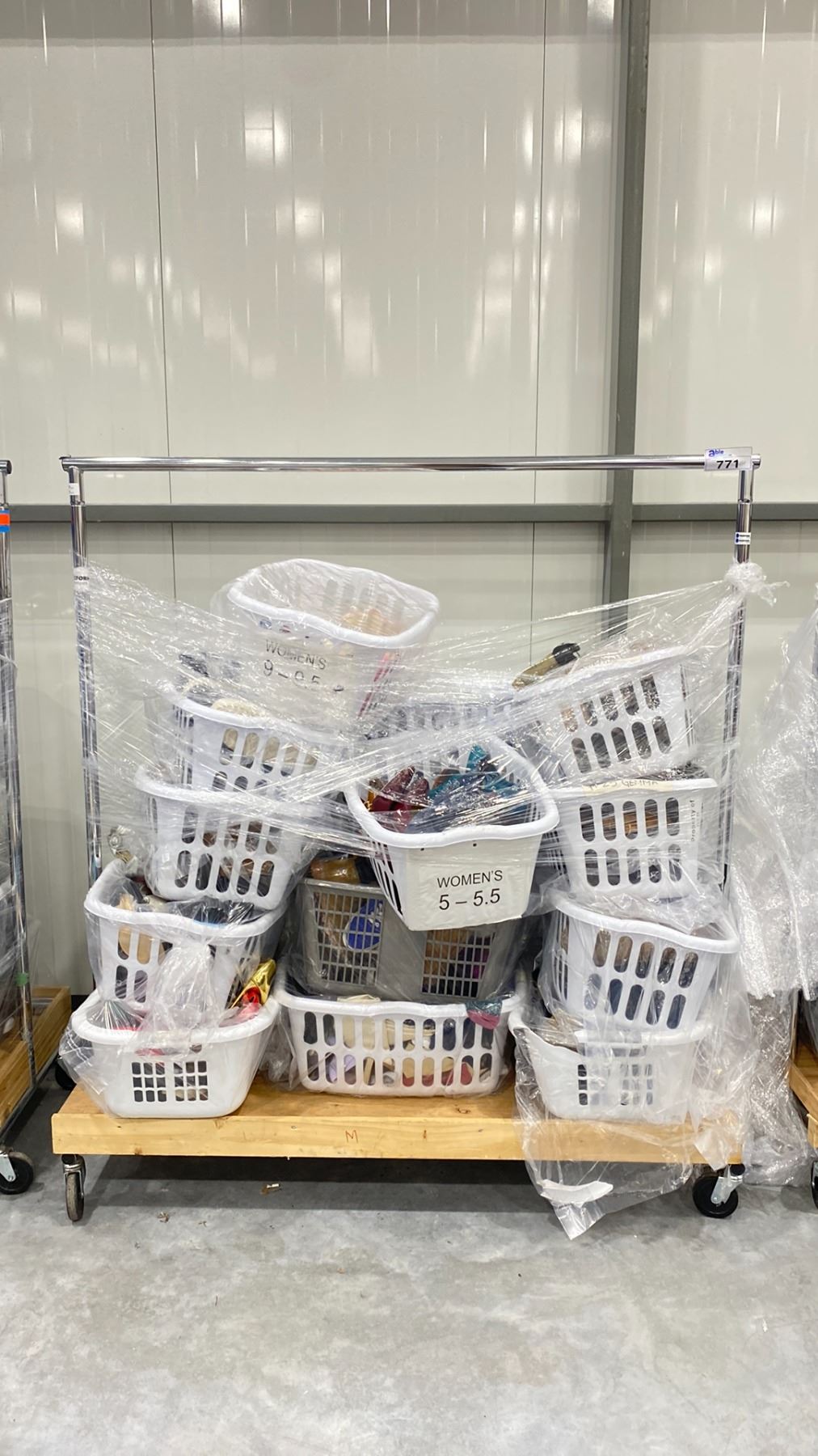 ROLLING RACK OF ASSORTED SHOES (RACK INCLUDED & MUST BE TAKEN)