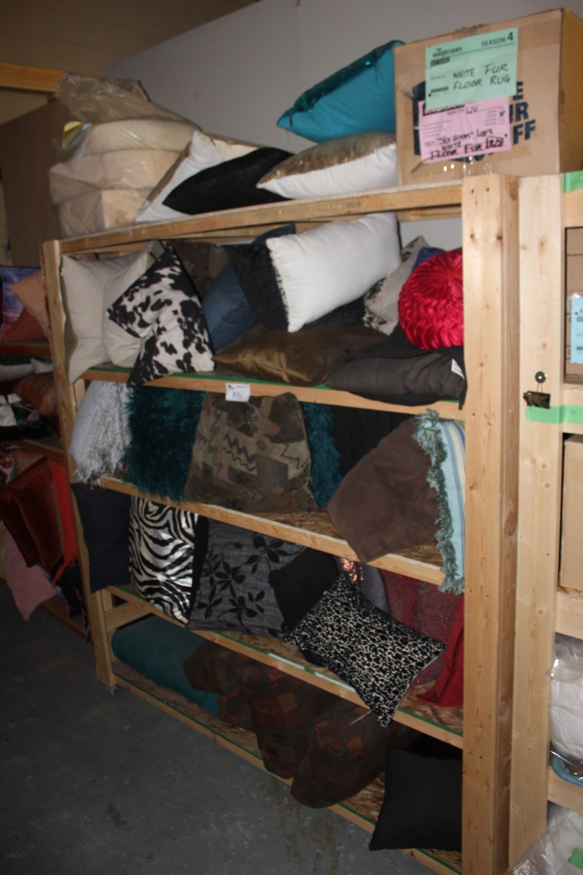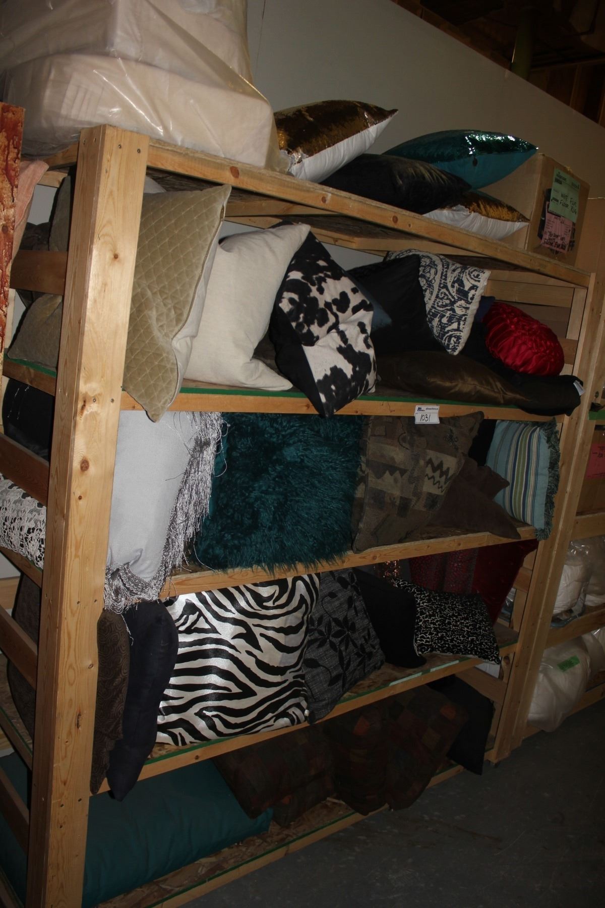 ROLLING SHELVES WITH DECORATIVE PILLOWS, RACK INCLUDED