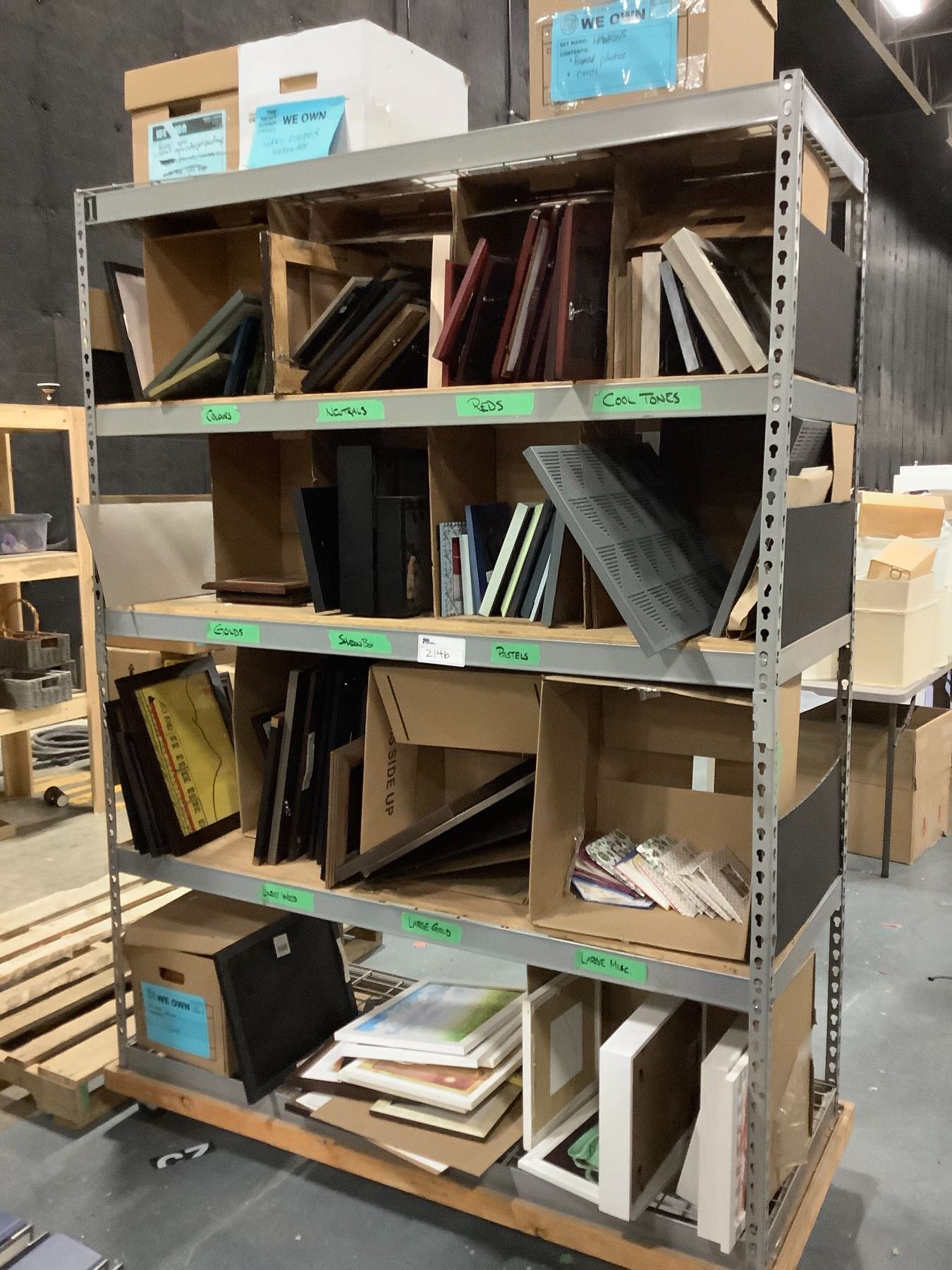 ROLLING SHELVING UNIT WITH SET DEC ITEMS, MOSTLY PICTURES