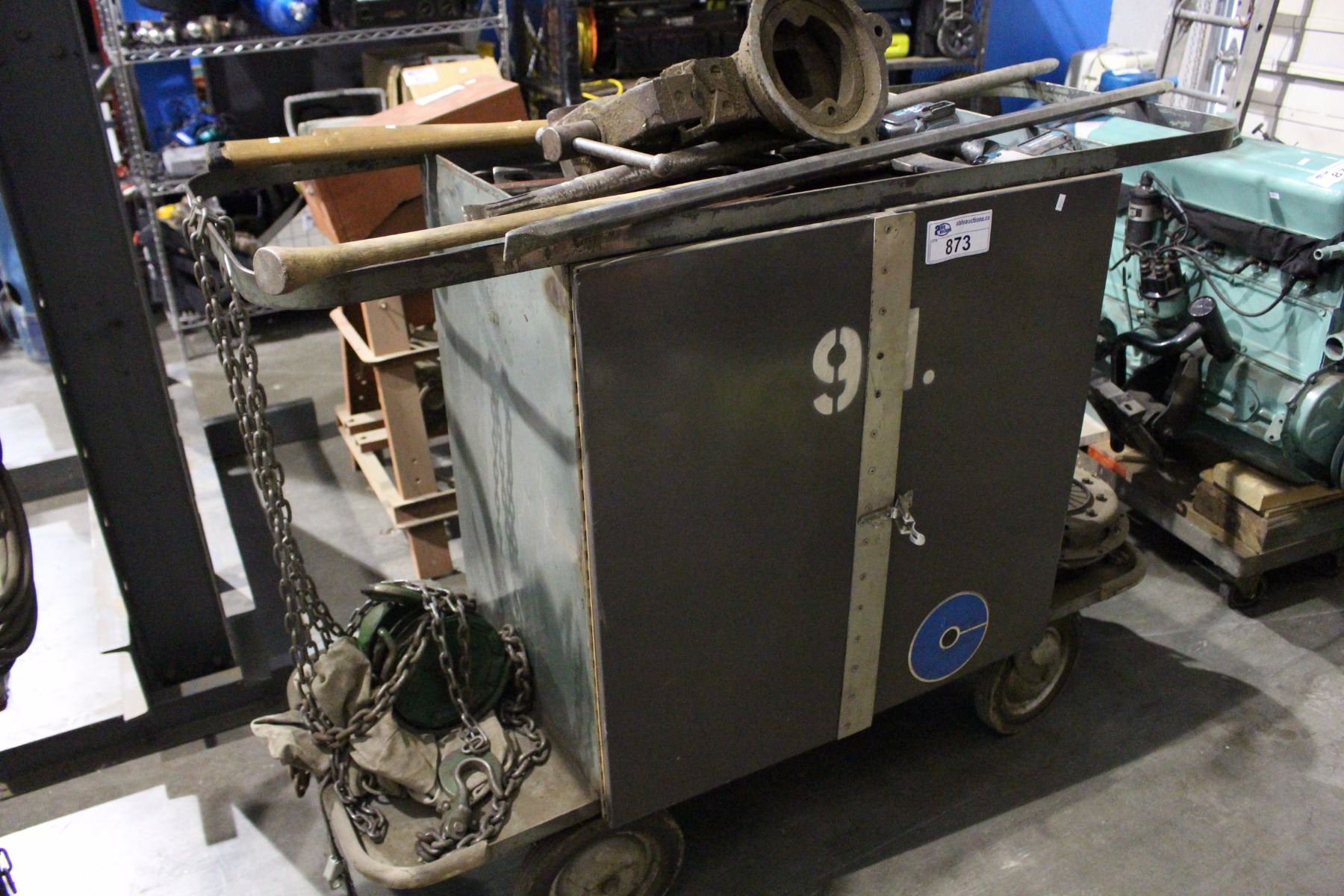 ROLLING TOOL CABINET WITH VICE SLEDGE HAMMER, AXE, MAKITA DRILL AND CONTENTS