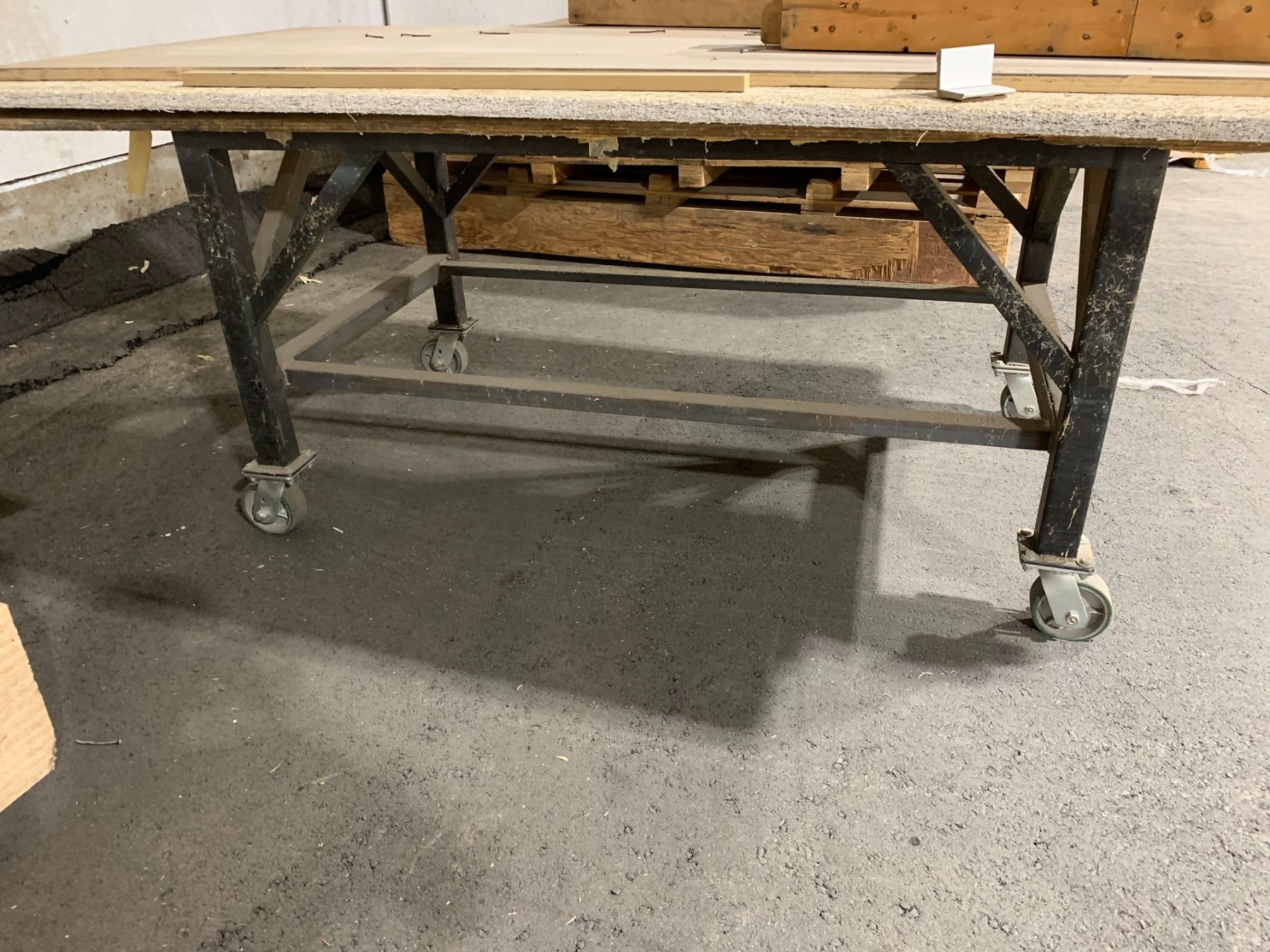 ROLLING WORK TABLE - STEEL FRAME WITH APPROX.8FT X 3 1/2FT PLYWOOD TOP