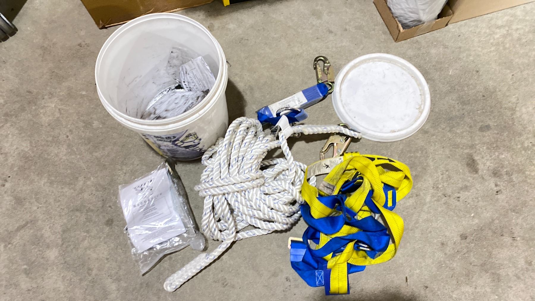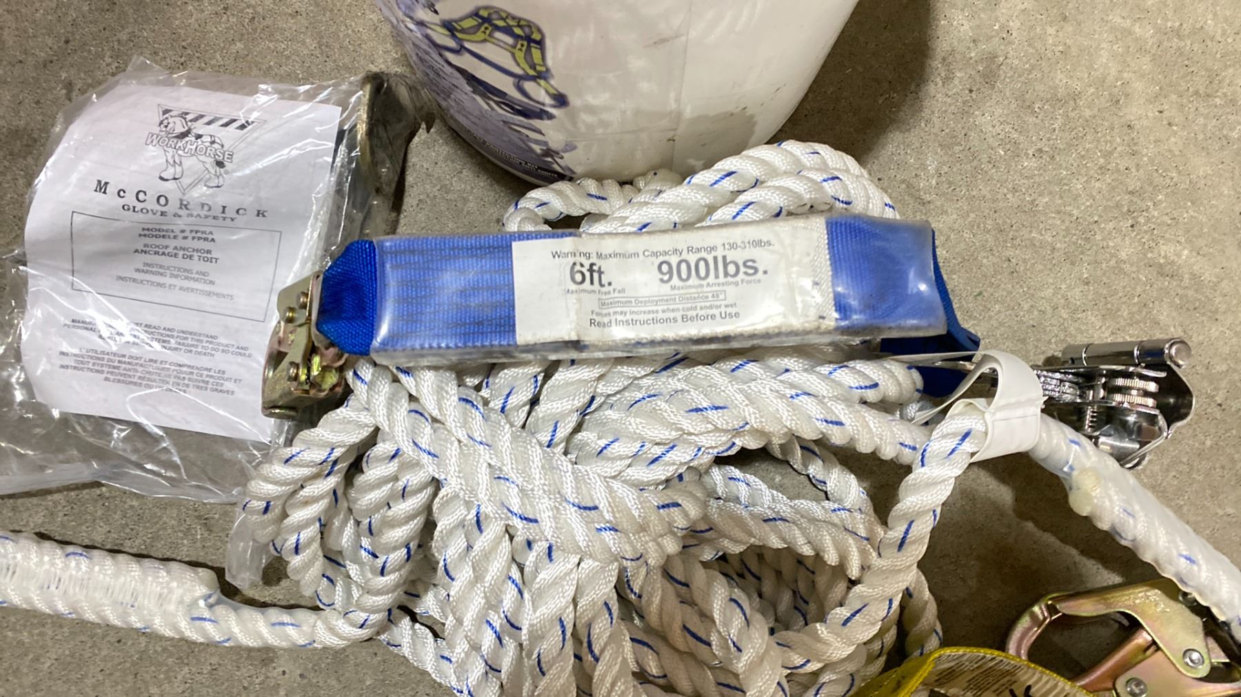 ROOFERS SAFETY BUCKET FULL BODY HARNESS, SHOCK ABSORBING LANYARD, 50' LINE WITH SNAP HOOK, REUSABLE ROOF ANCHOR