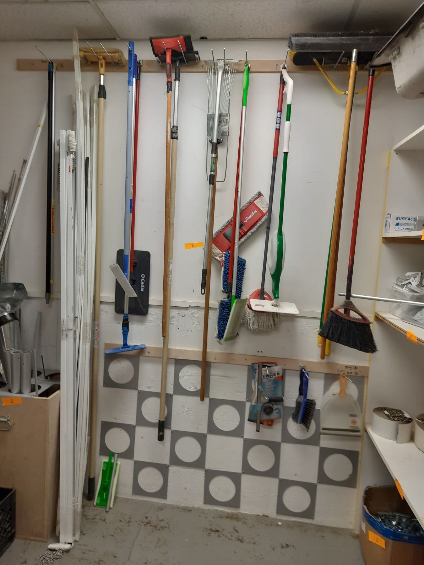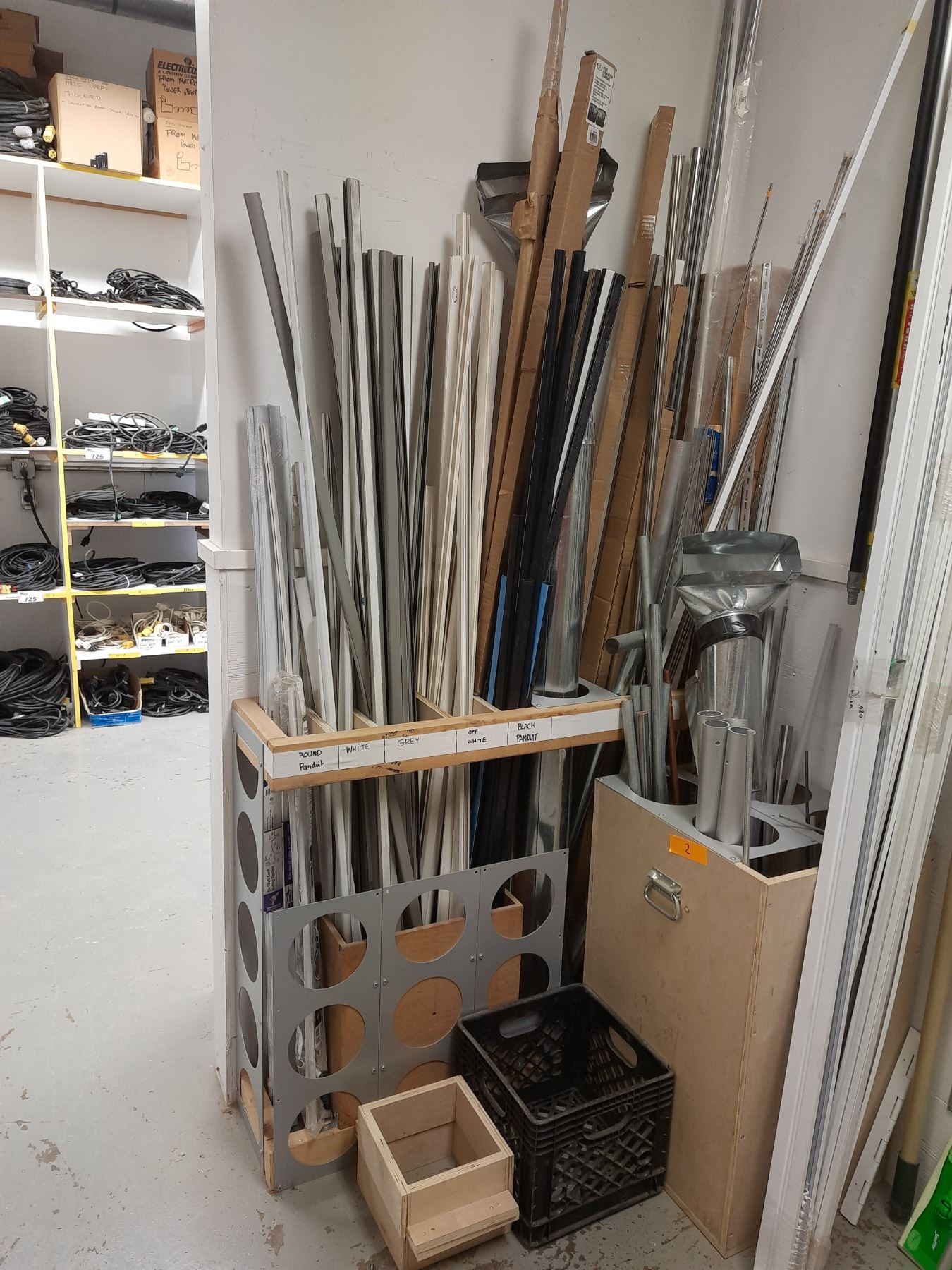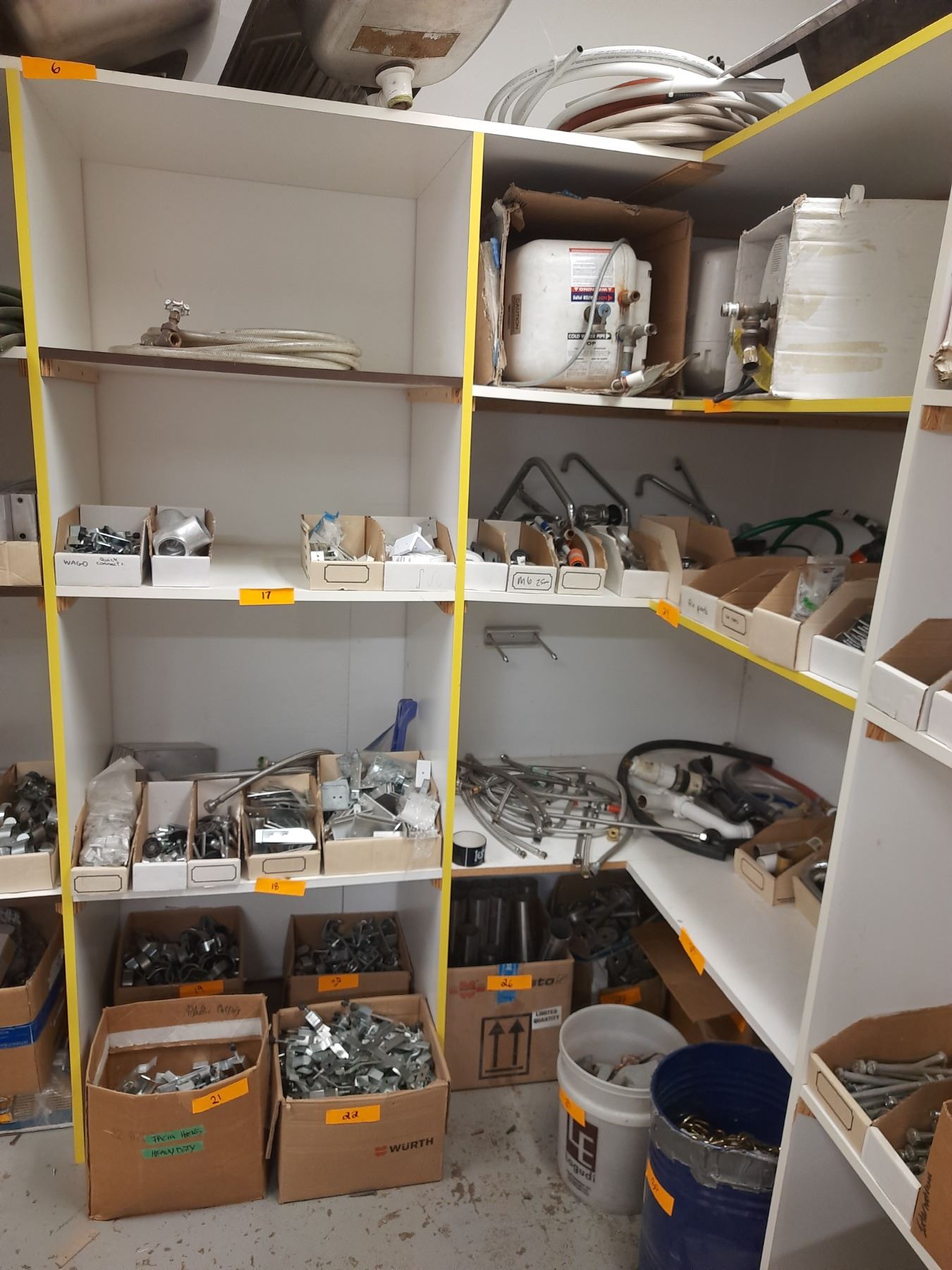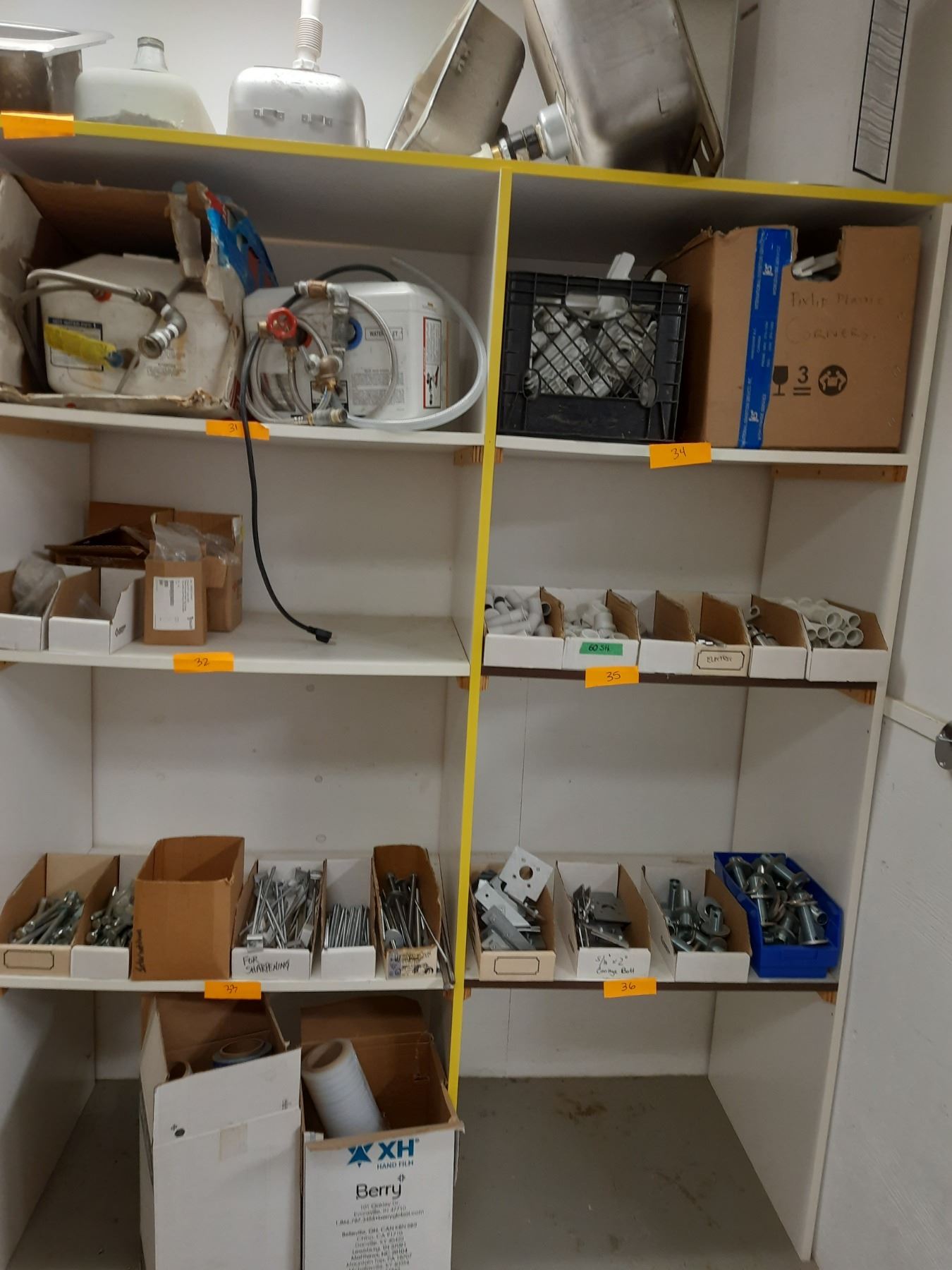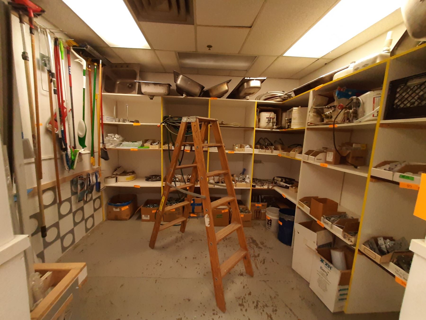 ROOM OF ASSORTED STAINLESS STEEL SINKS, 2 MINI WATER HEATERS, PLUMBING SUPPLIES, JANITORIAL SUPPLIES, METAL FINISHINGS & 6' WOODEN STEP LADDER