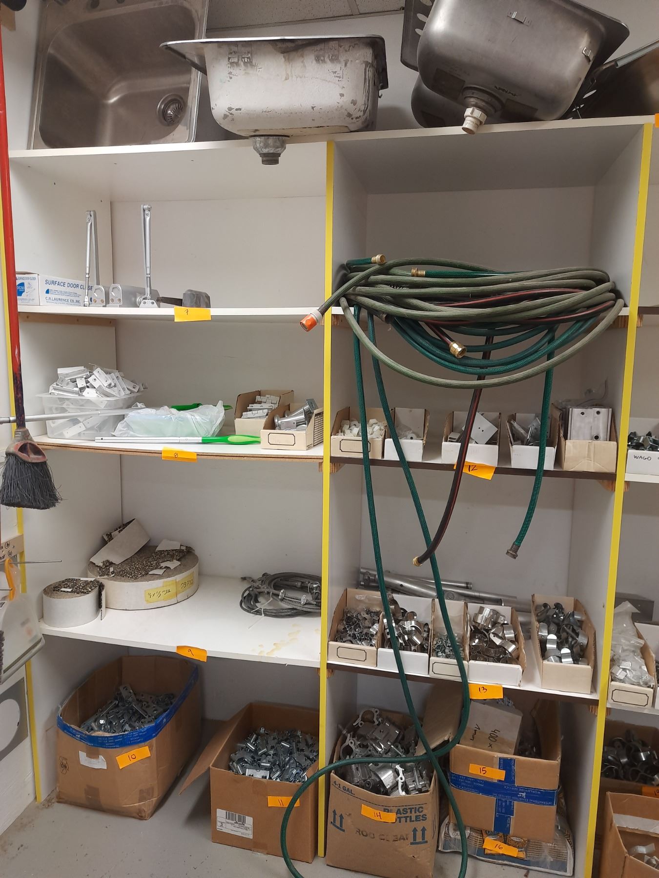 ROOM OF ASSORTED STAINLESS STEEL SINKS, 2 MINI WATER HEATERS, PLUMBING SUPPLIES, JANITORIAL