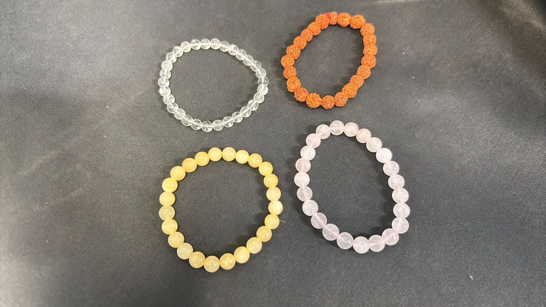 ROSE QUARTZ BRACELET, CLEAR QUARTZ BRACELET, YELLOW CALCITE BRACELET & A RUDRAKSHA BRACELET