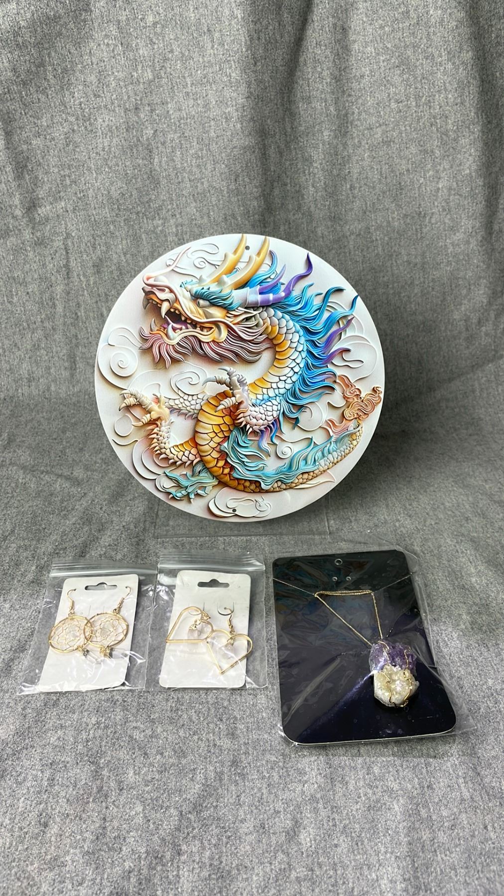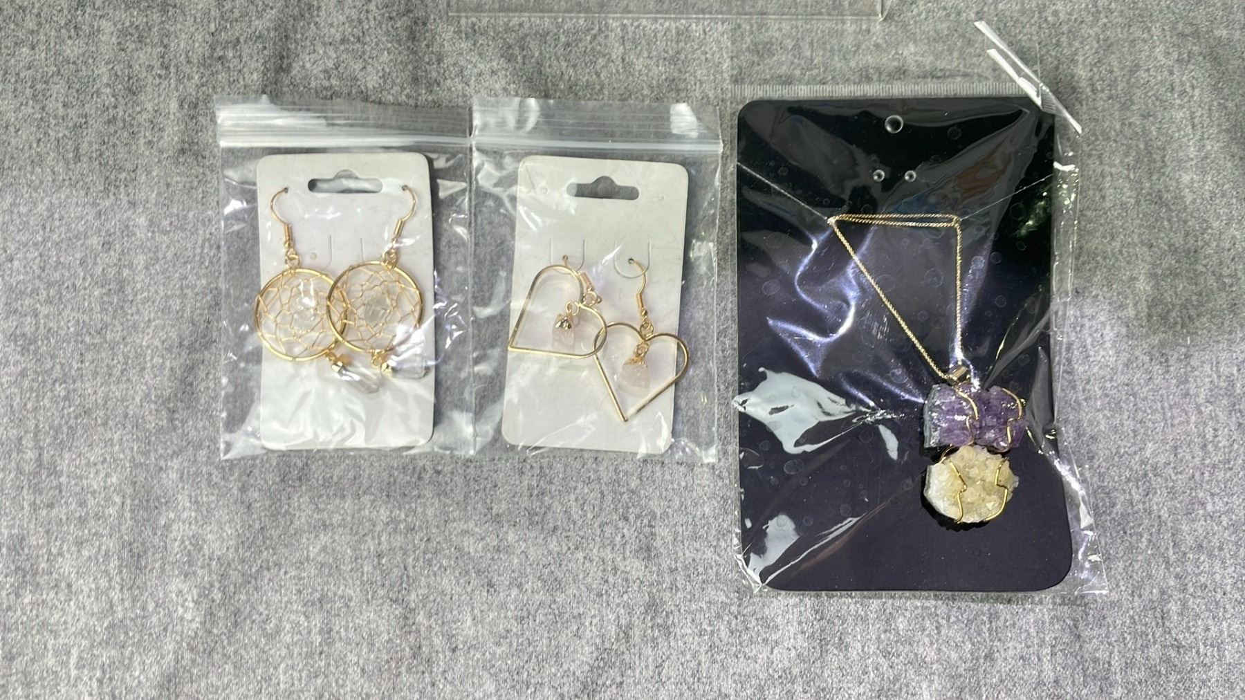 ROSE QUARTZ EARRING, CLEAR QUARTZ EARRING, AMETHYST CITRINE NECKLACE & FENG SHUI ART