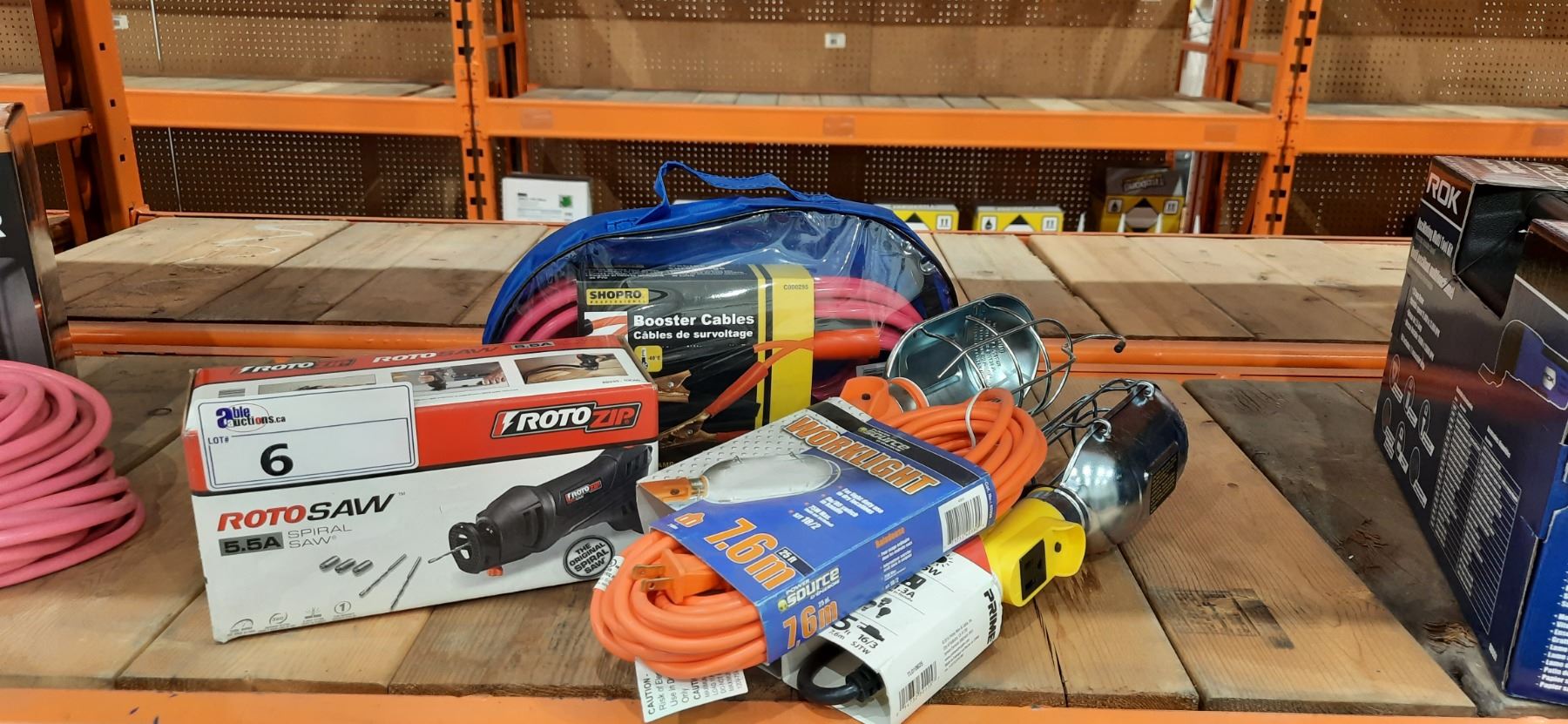 ROTOZIP 5.5A ELECTRIC SPIRAL SAW, SHOPRO VEHICLE JUMPER CABLES, & 2 ELECTRIC WORKLIGHTS