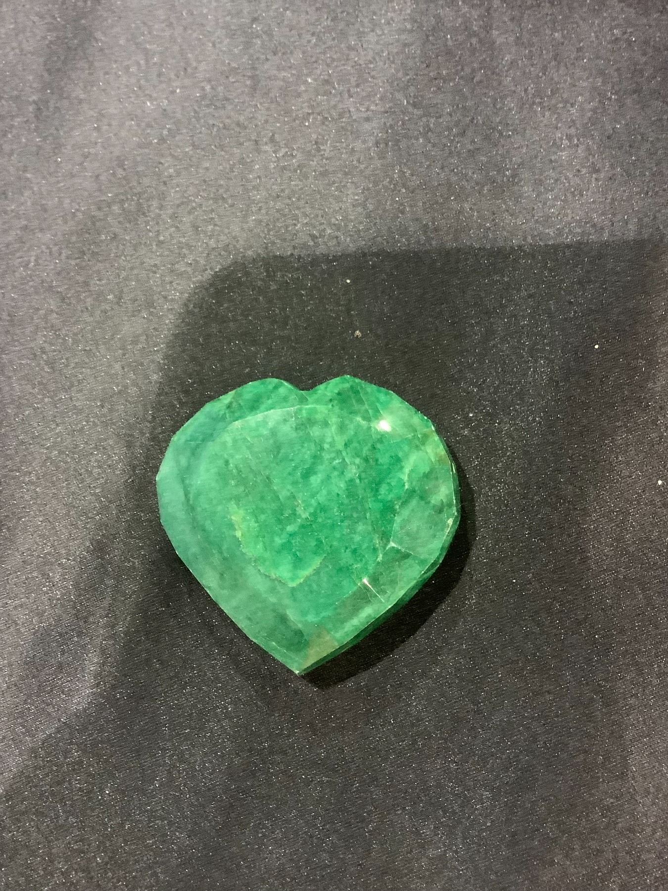ROUGH MINERAL POLISHED EMERALD 288.90CT - 57.78G, 68 X 51 X 32MM, HEART CUT, BRAZIL, COLOUR