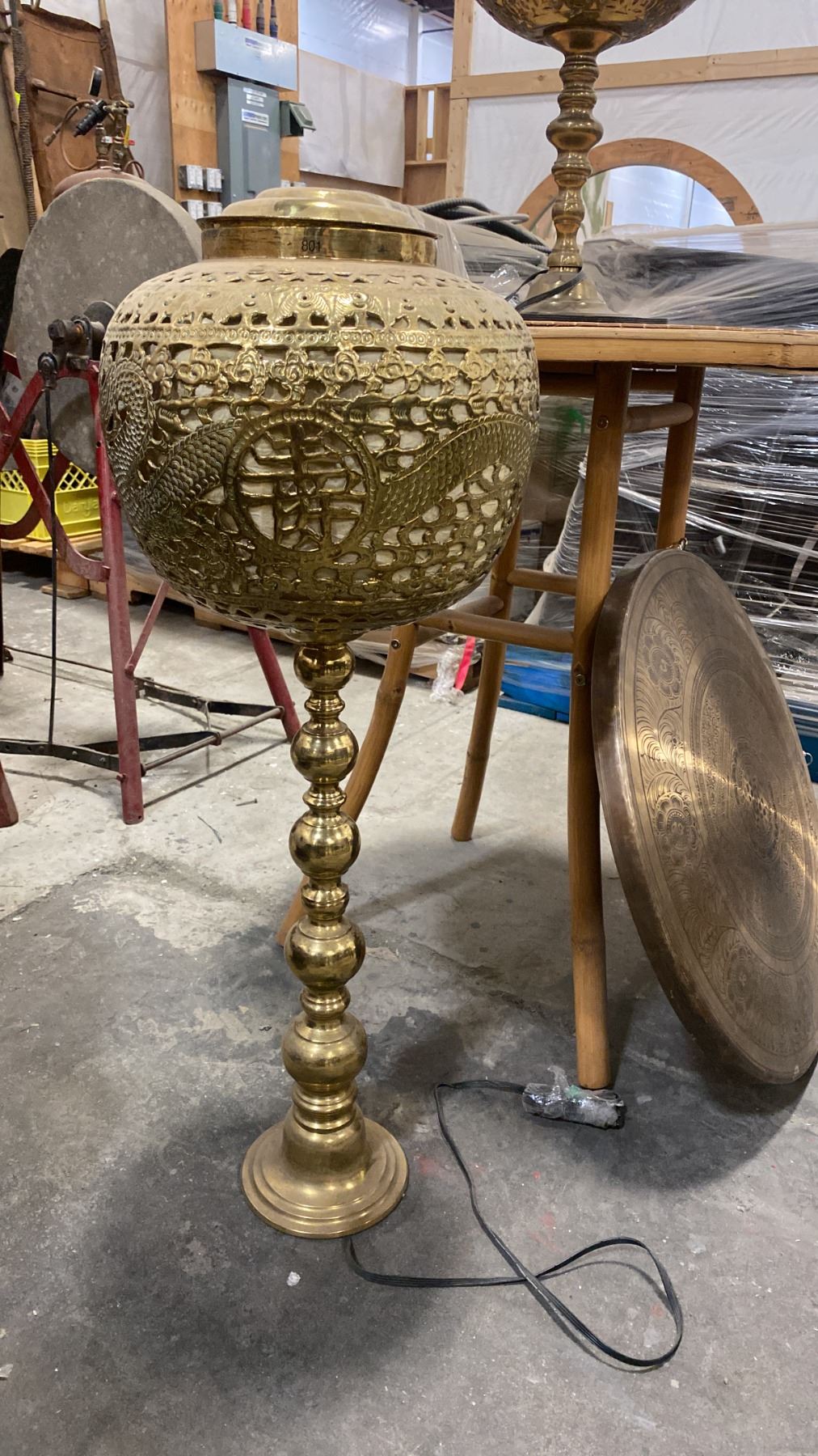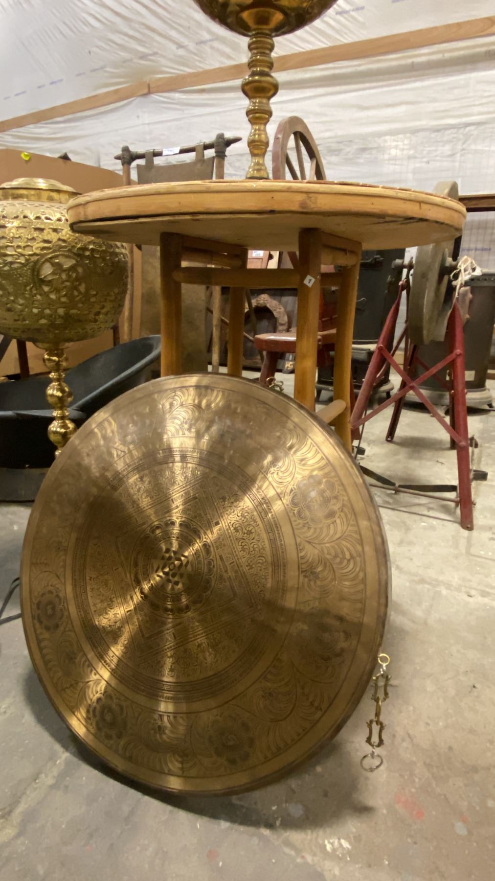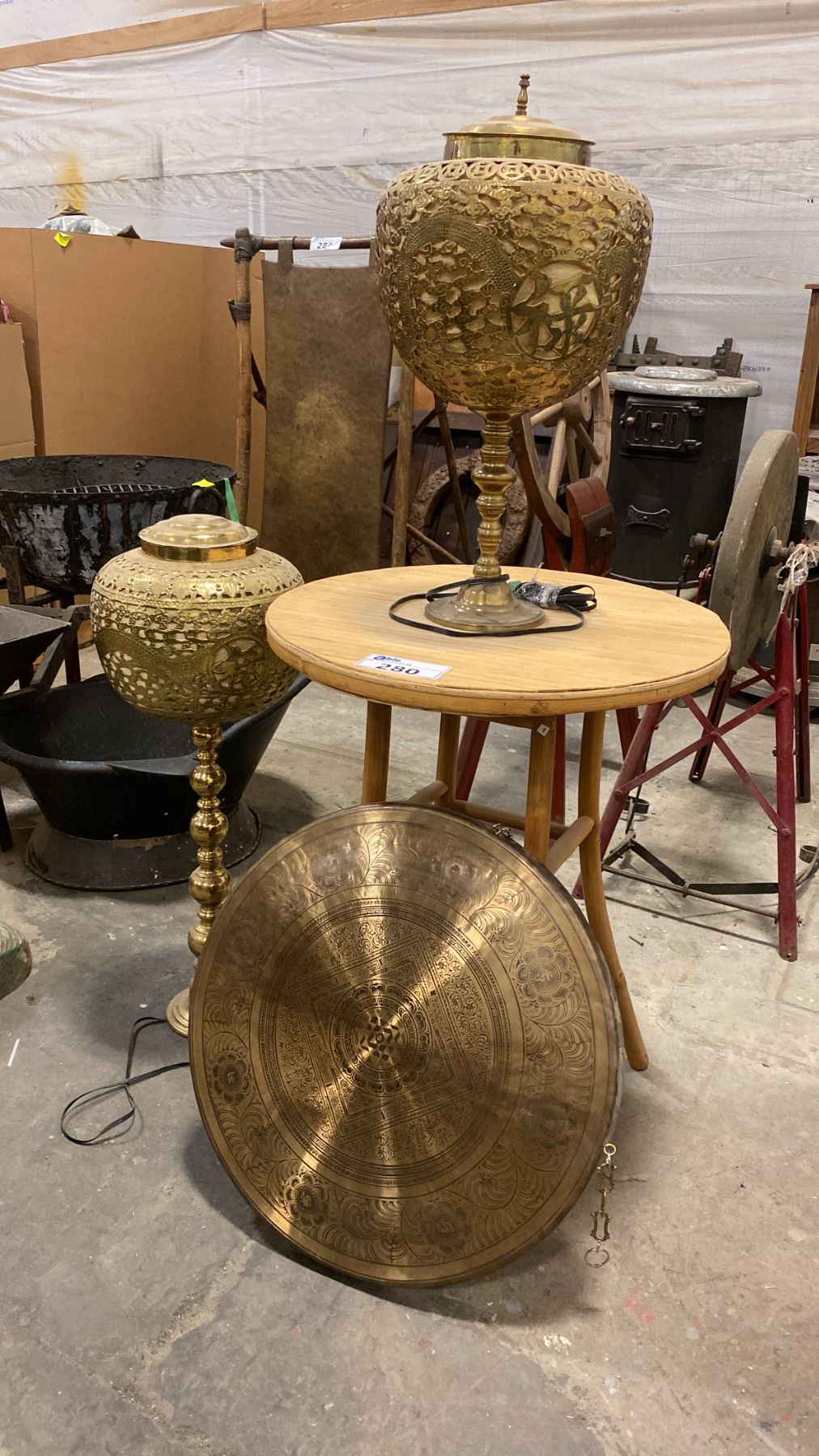 ROUND BAMBOO TABLE, BRASS ASIAN BONG, 2 LAMPS