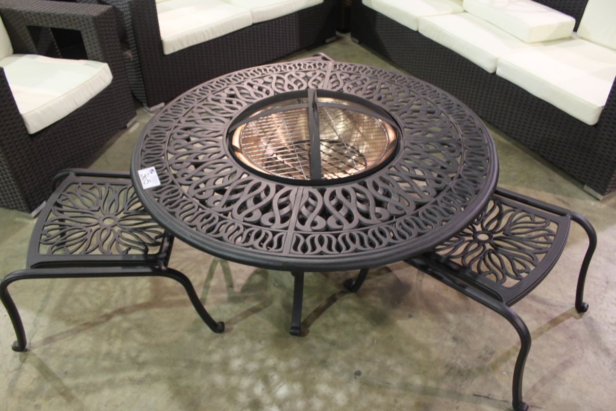 ROUND CAST ALUMINUM PATIO TABLE WITH FIRE PIT & 3 STOOLS