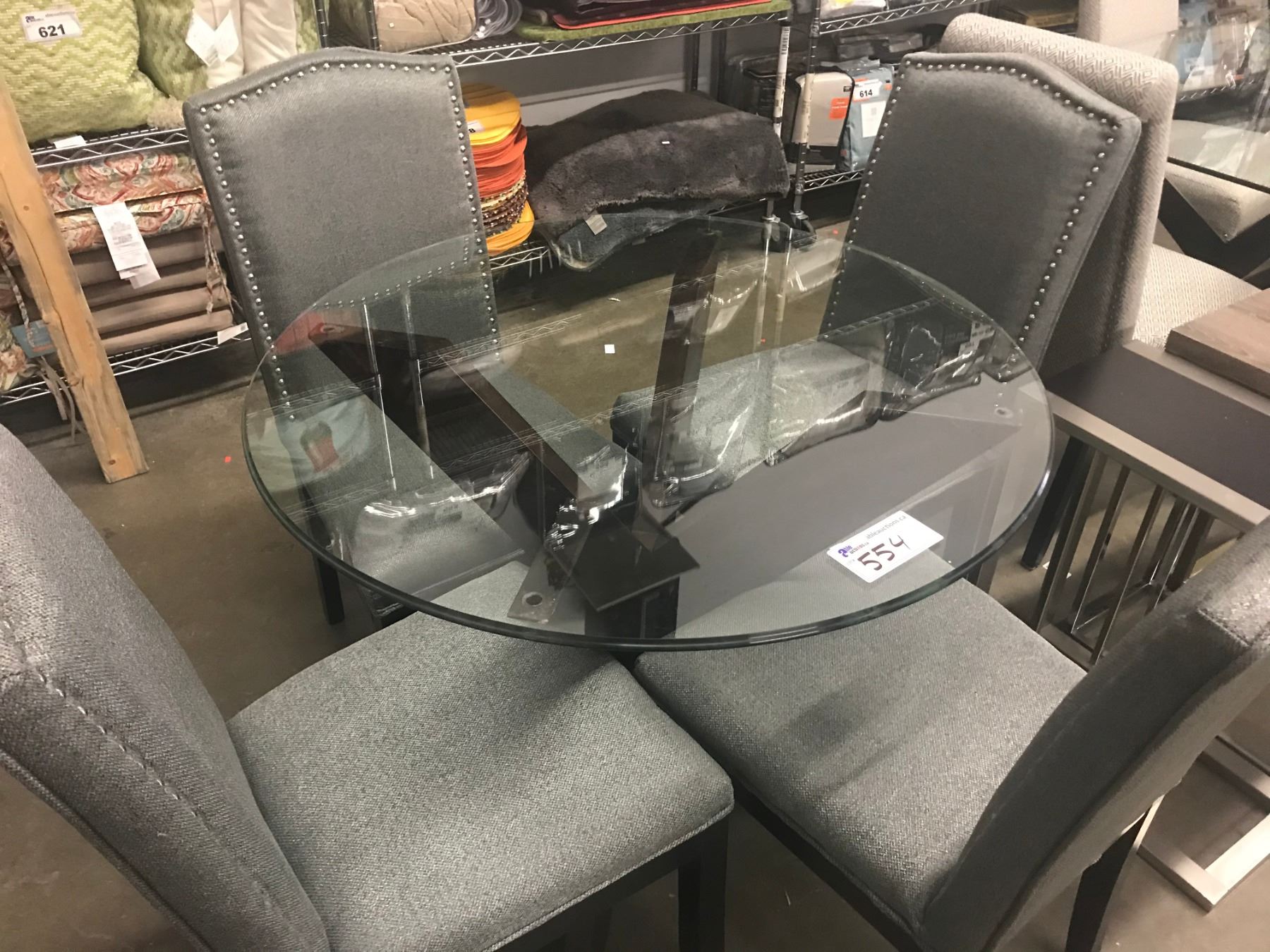 ROUND GLASS TABLE & 4 GREY STUDDED CHAIRS