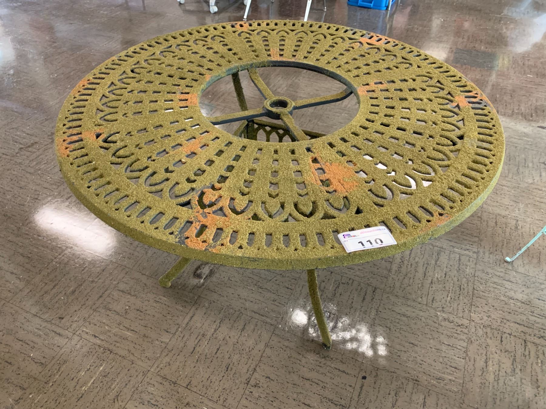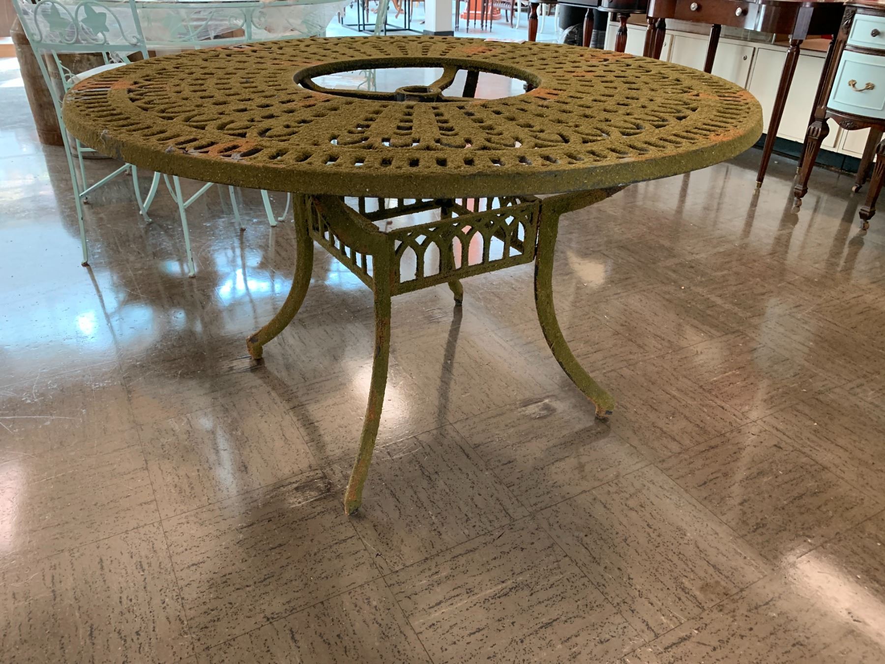 ROUND METAL PATIO TABLE COVERED WITH MOSS APPROX 28"X48"