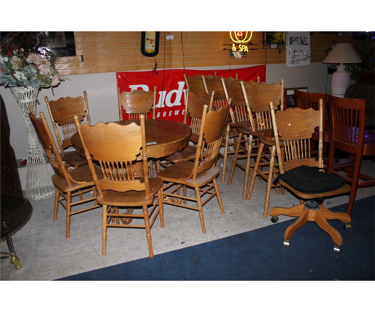 ROUND OAK TABLE, 6 OAK CHAIRS, 4 OAK BAR STOOLS AND MOBILE OAK OFFICE CHAIR