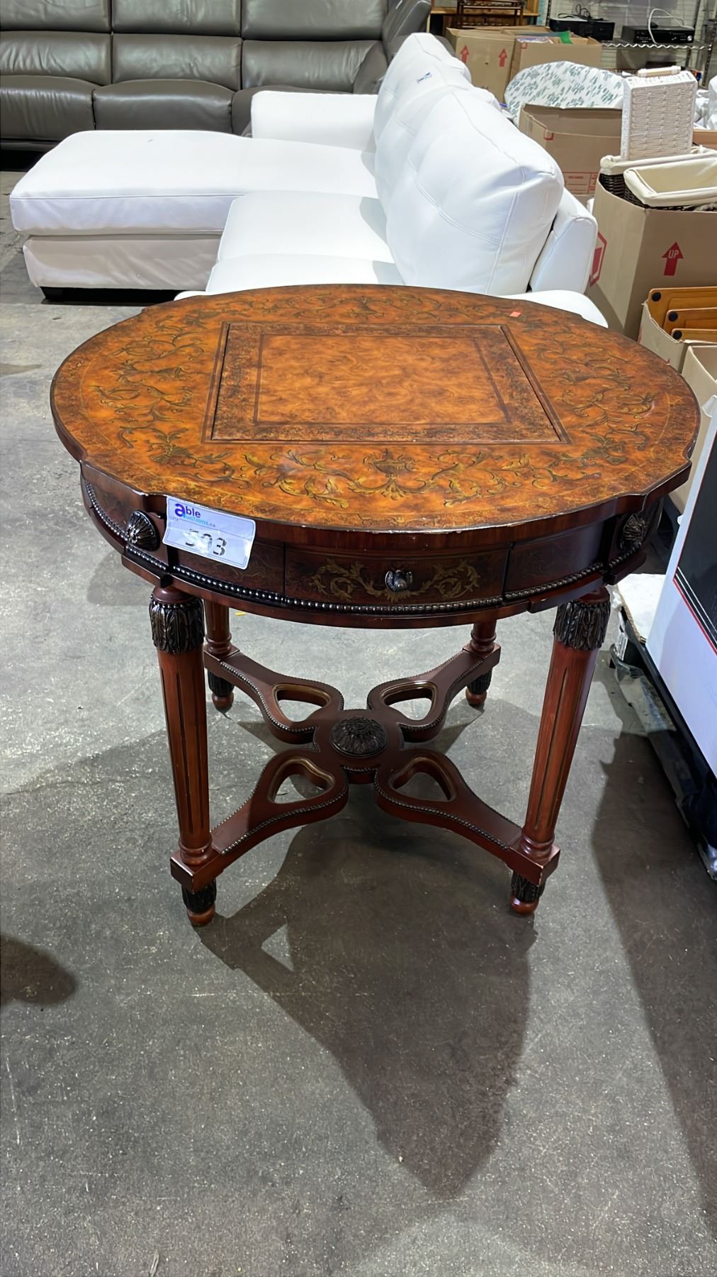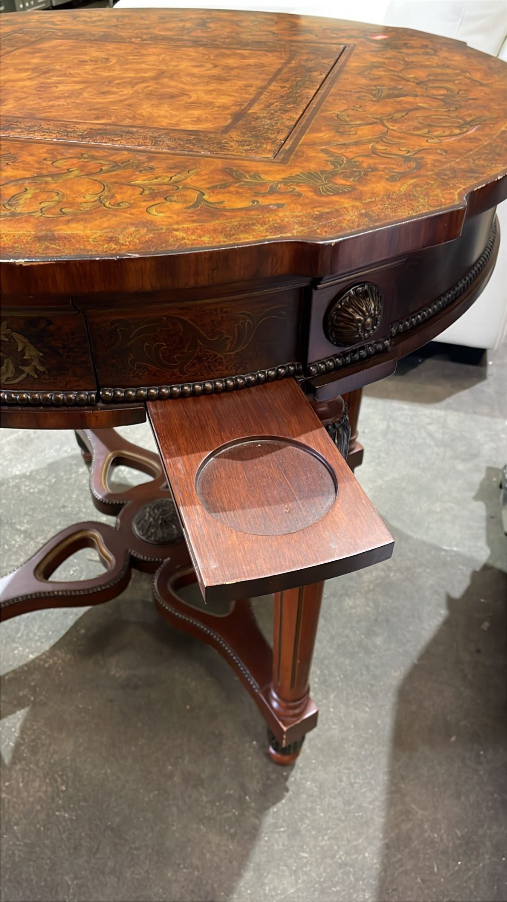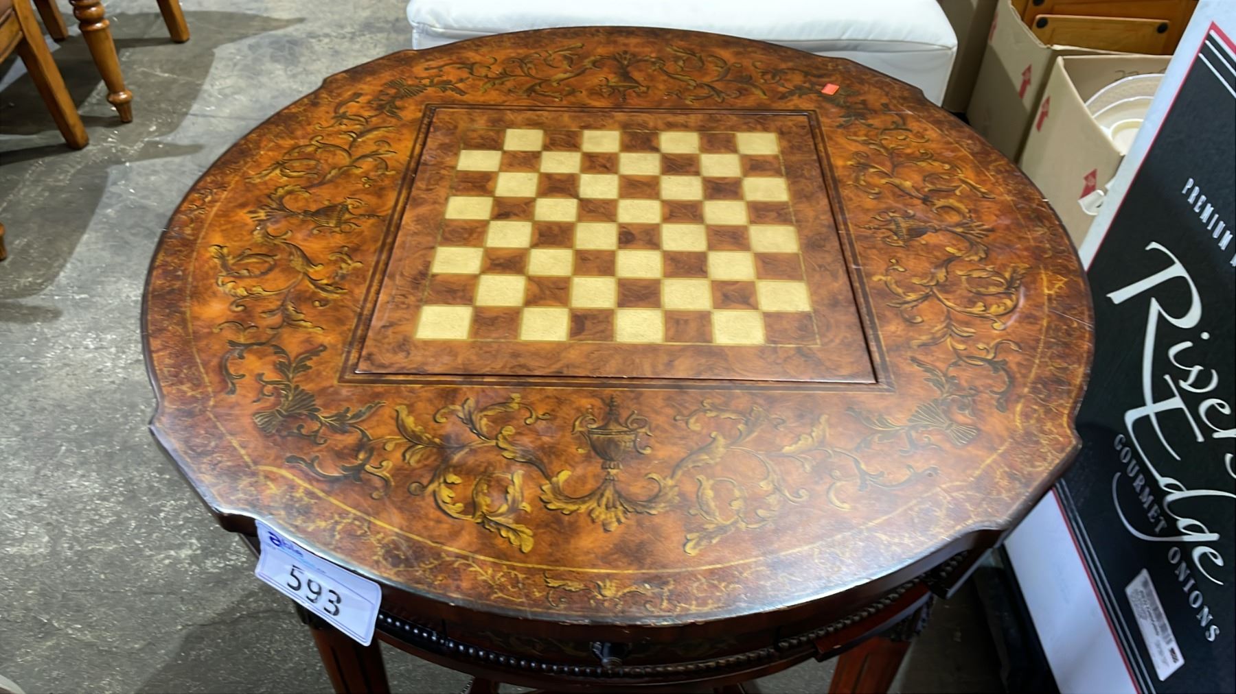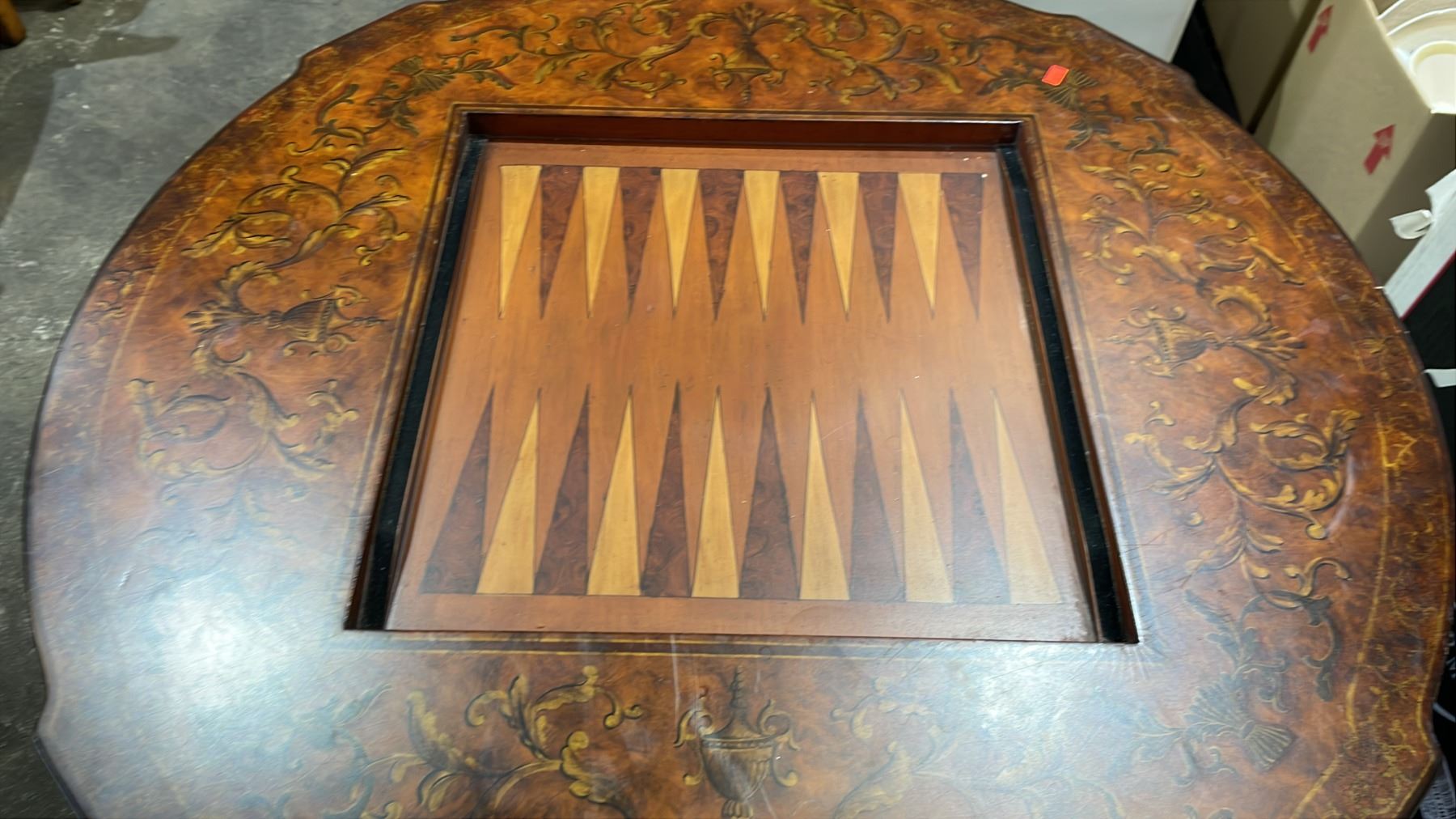 ROUND WOODEN CHESS & BACKGAMMON TABLE WITH DRAWER FOR PIECES *NO PIECES* - 33" DIA.