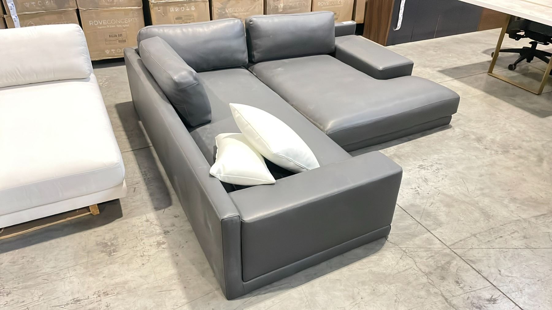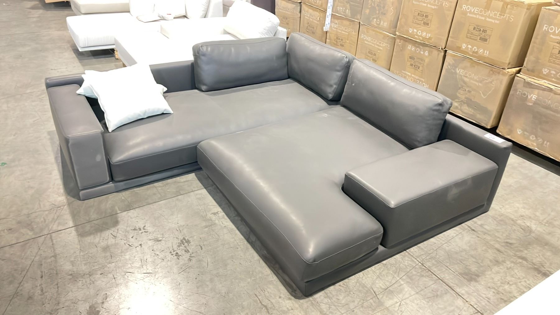 ROVE CONCEPTS DESIGNER 2 PCS GREY LEATHER OVER SIZED DEEP SECTIONAL SOFA *DISPLAY ONLY, NOT IN BOX, MISSING LEGS*