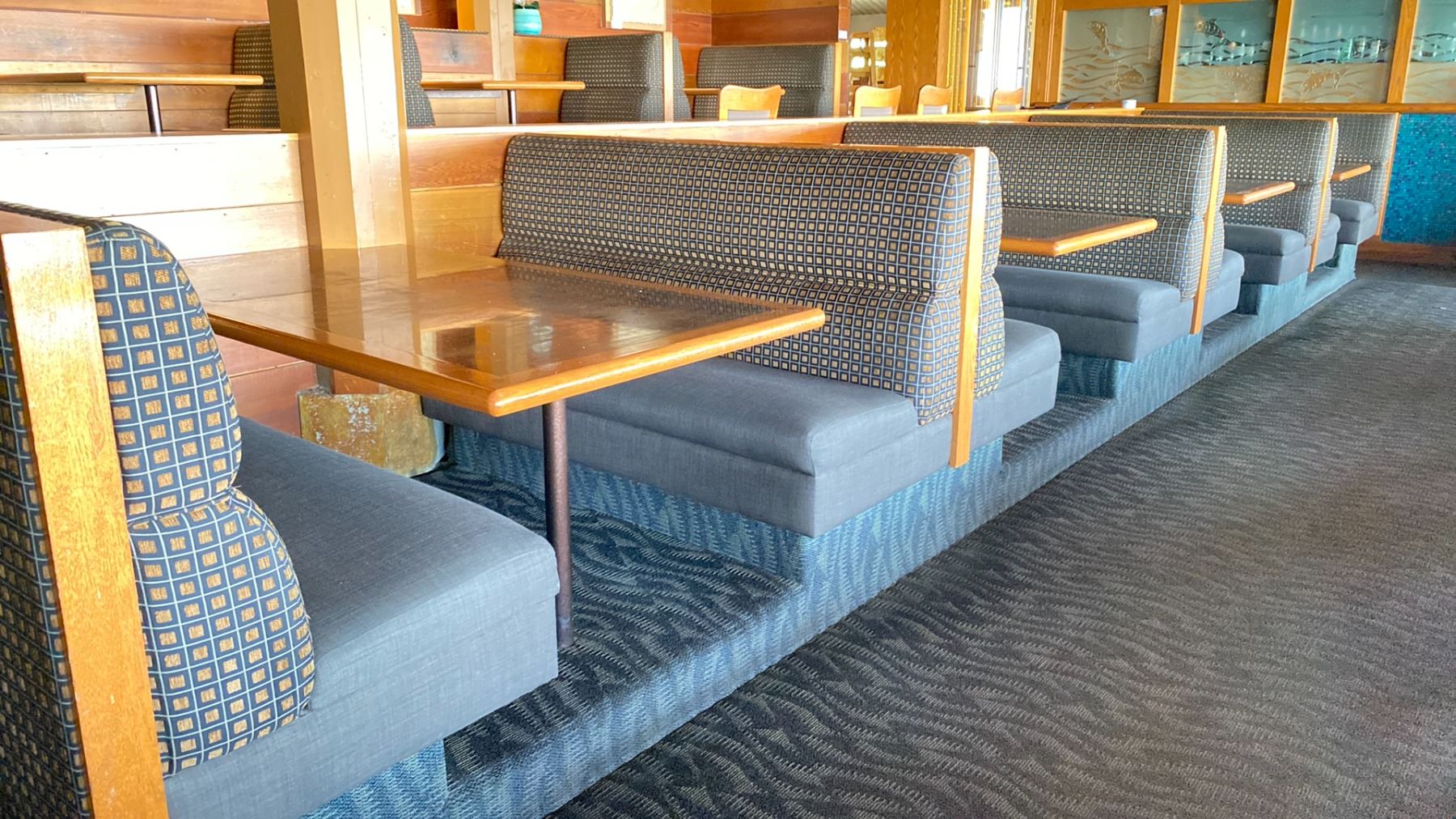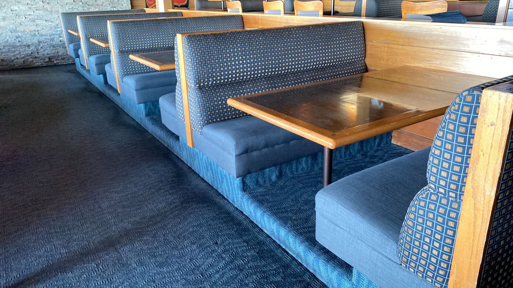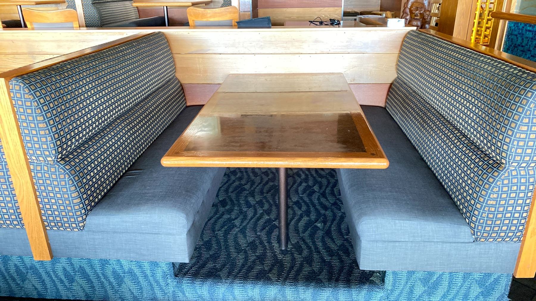 ROW OF 4 MOUNTED RESTAURANT SEATING BOOTHS BENCHES AND TABLES *TO BE DISMANTLED, REQUIRES TOOLS & HELP FOR REMOVAL*