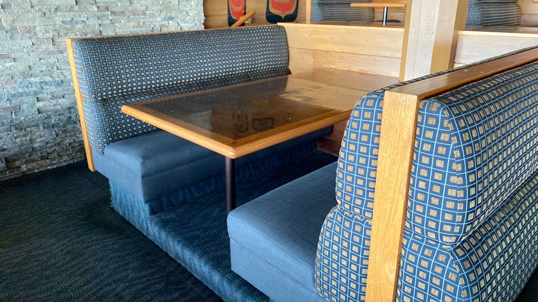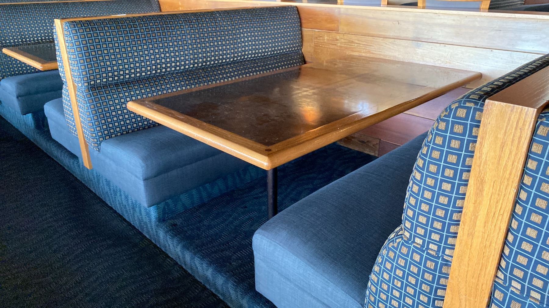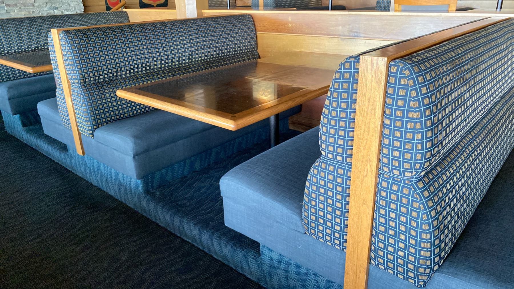 ROW OF 4 MOUNTED RESTAURANT SEATING BOOTHS BENCHES AND TABLES *TO BE DISMANTLED, REQUIRES TOOLS & HELP FOR REMOVAL*