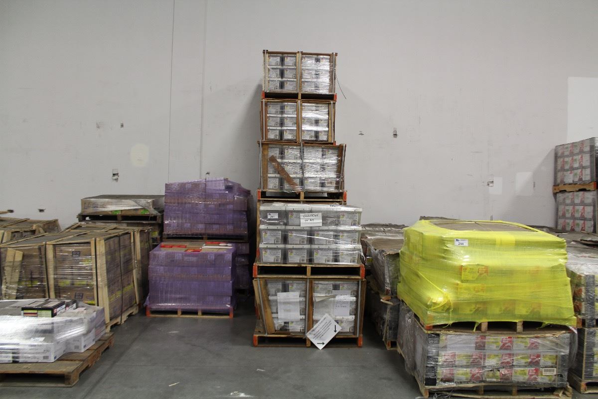 ROW OF APPROX. 10 PALLETS OF ASSORTED SIZE EXTERIOR SCREWS (TAN)