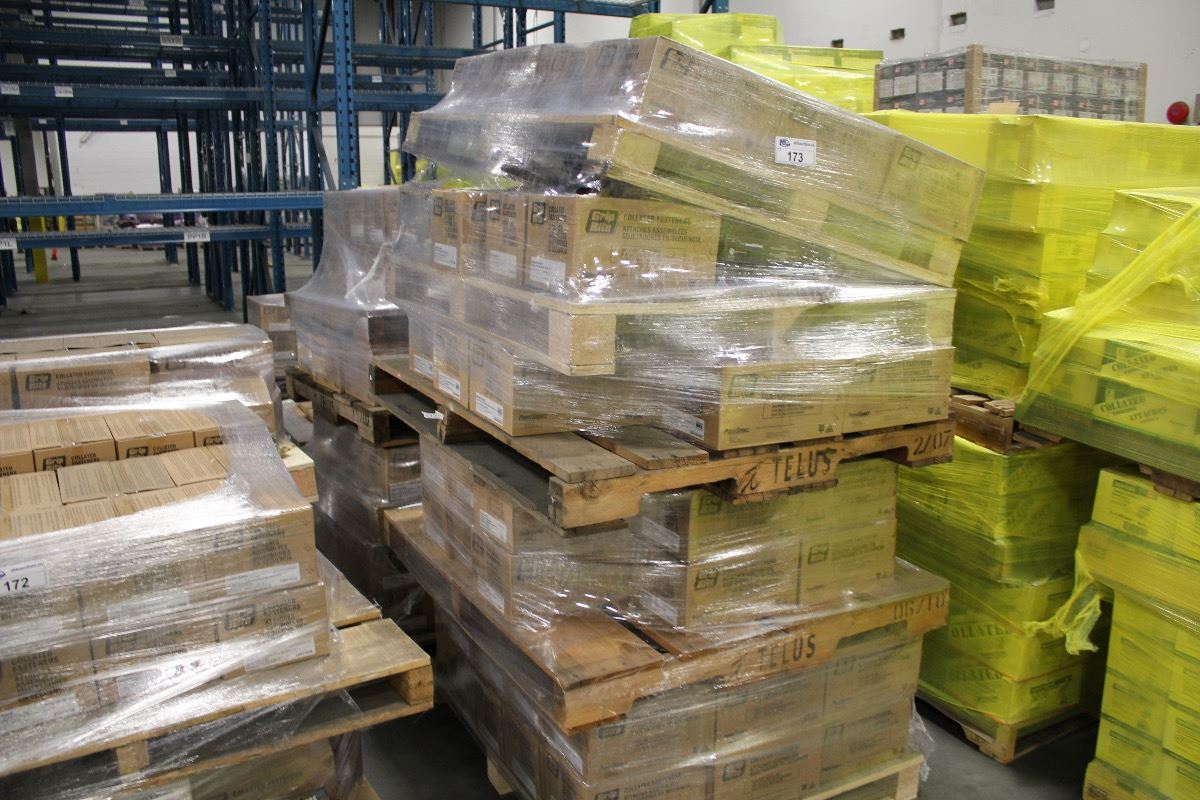 ROW OF APPROX. 11 PALLETS OF ASSORTED COLLATED STAPLES & NAILS