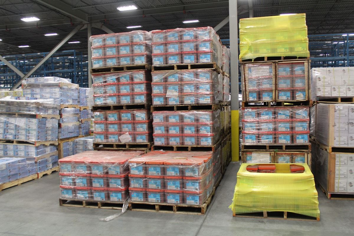 ROW OF APPROX. 13 PALLETS OF ASSORTED SIZE PLASTIC CAP NAILS
