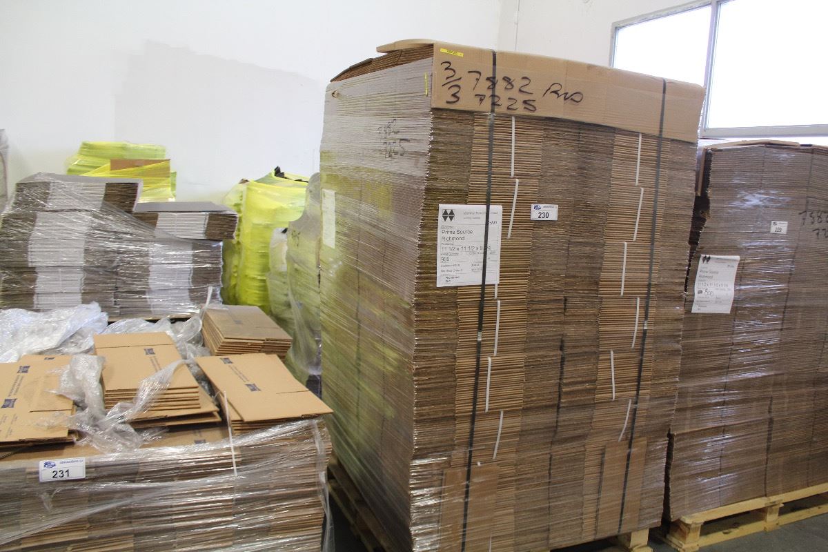 ROW OF APPROX. 5 PALLETS OF ASSORTED PACKAGING BOXES
