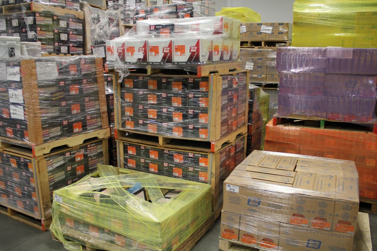 ROW OF APPROX. 6 PALLETS OF ASSORTED SIZE CONSTRUCTION SCREWS