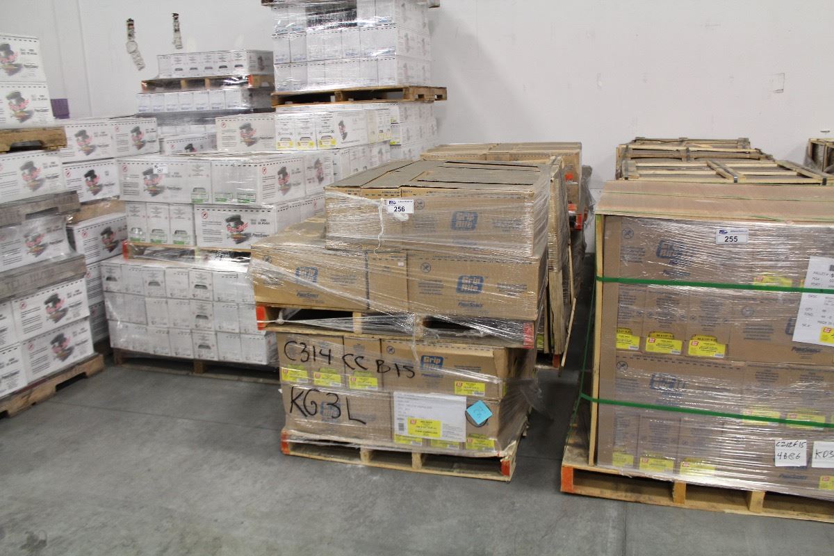 ROW OF APPROX. 7 PALLETS OF ASSORTED SIZE BOX NAILS & PARTICLE BOARD SCREWS