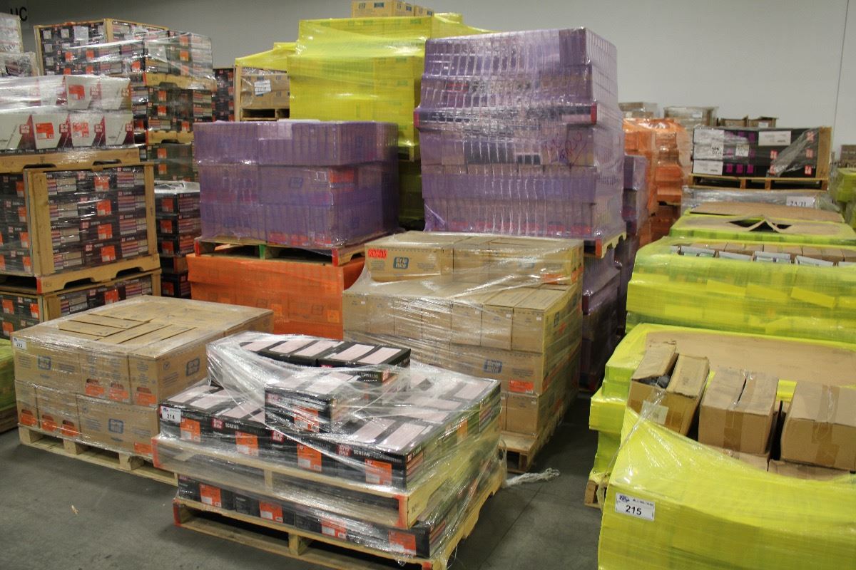 ROW OF APPROX. 7 PALLETS OF ASSORTED SIZE FLOORING SCREWS