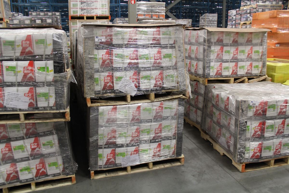 ROW OF APPROX. 8 PALLETS OF 12D X 3-1/4 SPIRAL NAILS