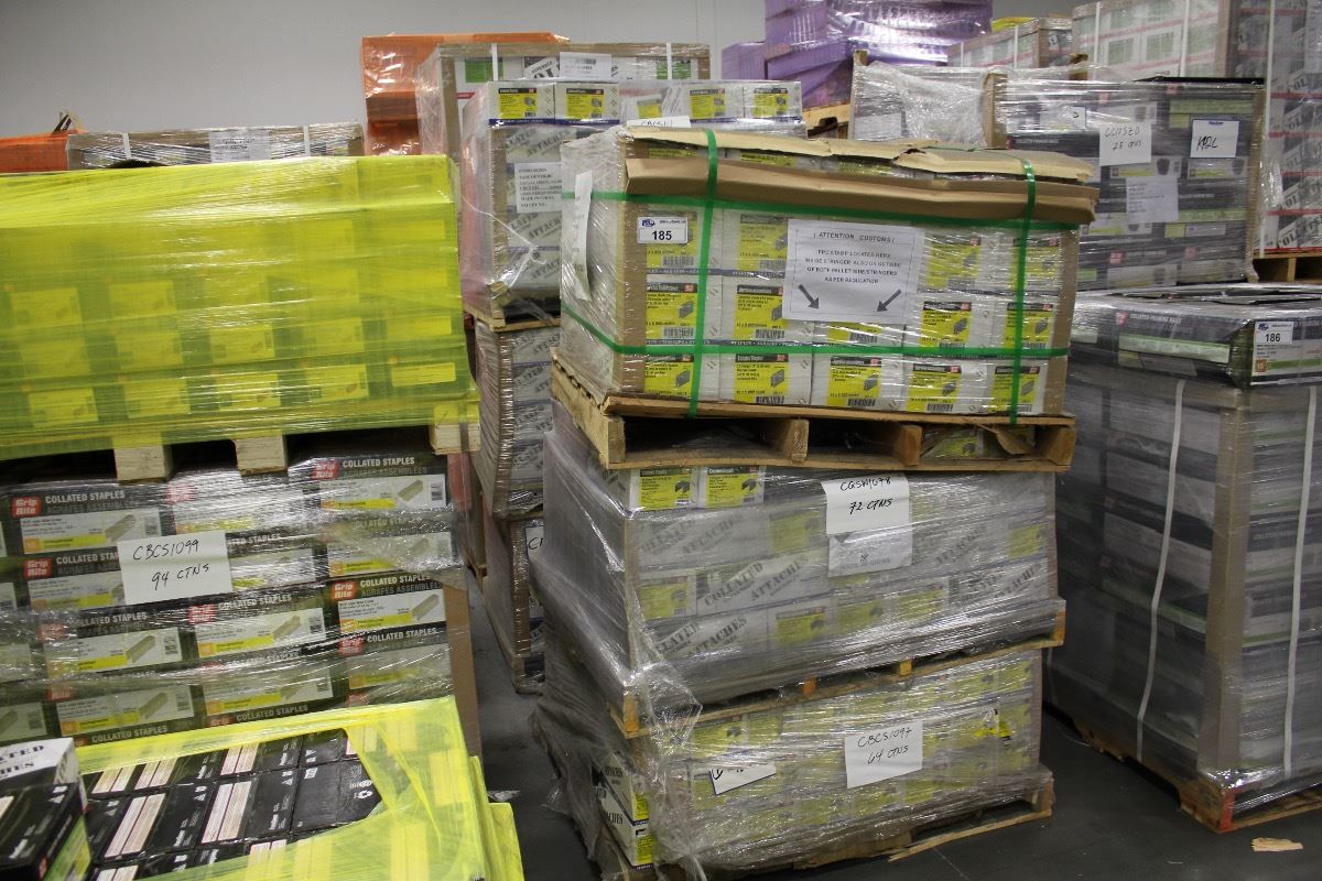 ROW OF APPROX. 8 PALLETS OF ASSORTED NARROW CROWN/WIDE CROWN STAPLES & ROUND HEAD FRAMING NAILS