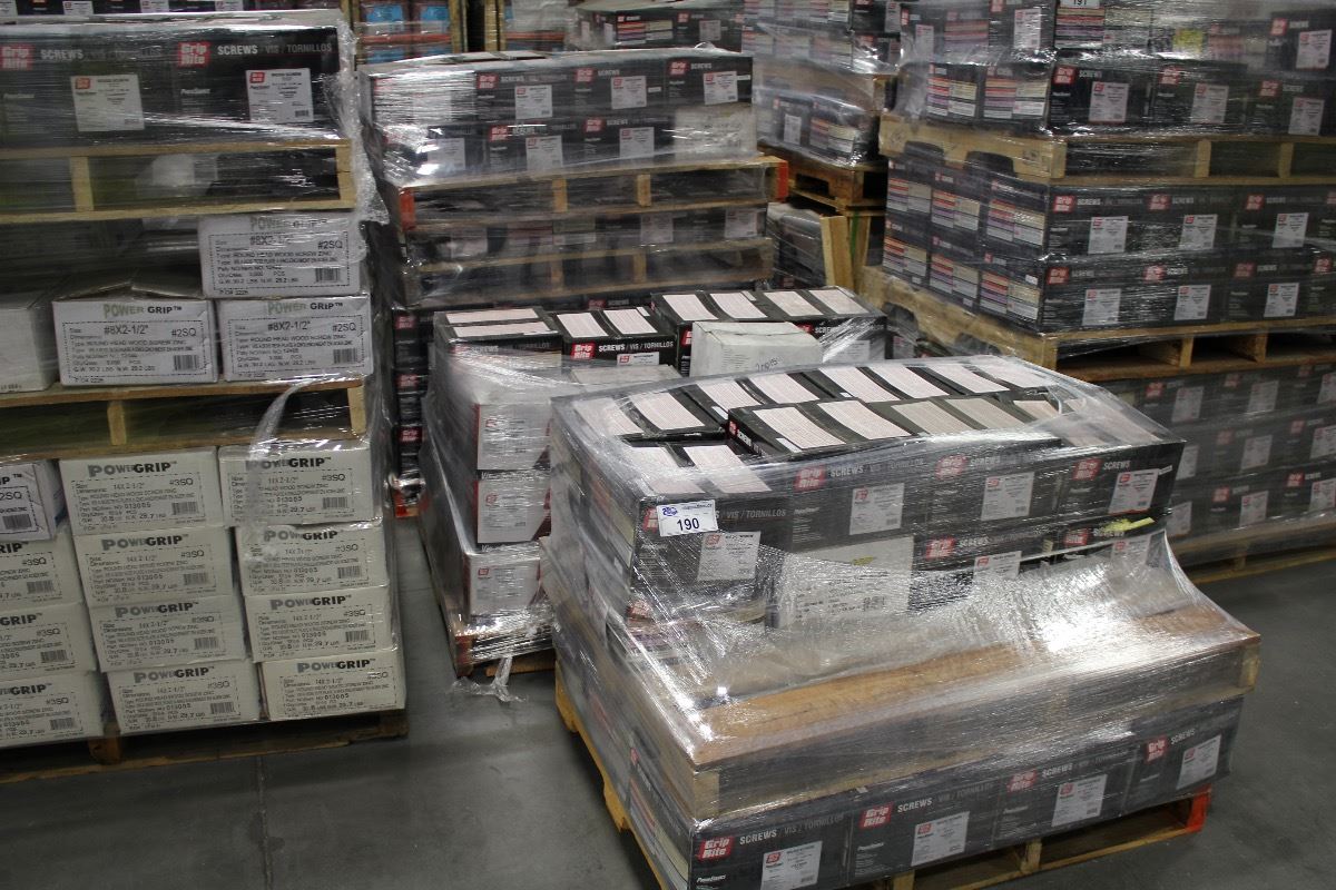 ROW OF APPROX. 9 PALLETS OF ASSORTED SIZE WOOD SCREWS