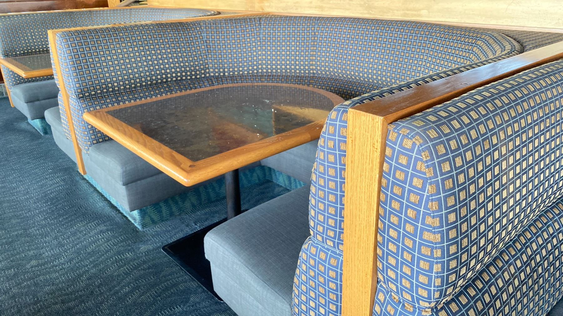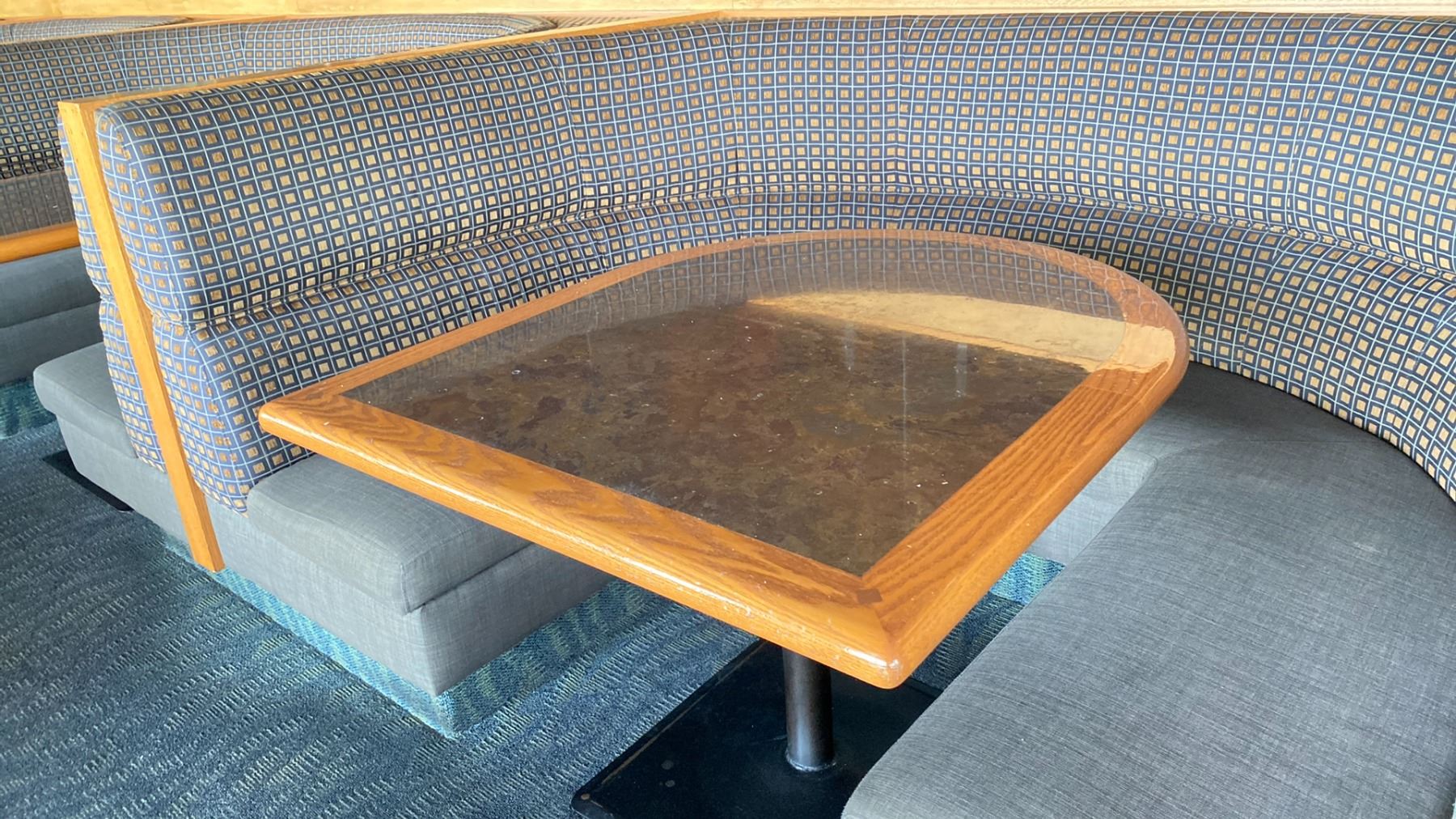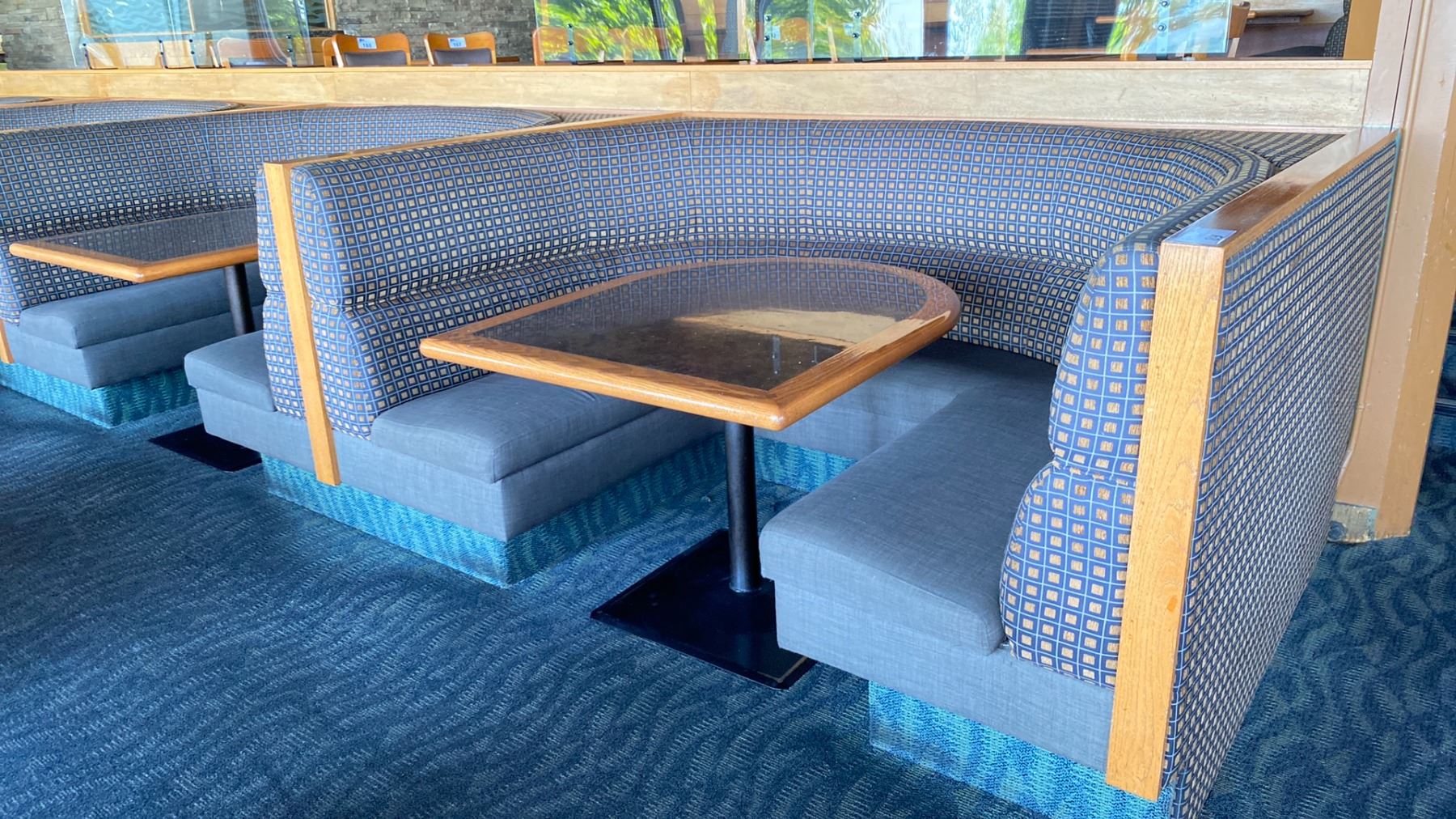 ROW OF MOUNTED HALF MOON RESTAURANT BOOTH SEATING BENCHES AND TABLES *TO BE DISMANTLED, REQUIRES TOOLS & HELP FOR REMOVAL*
