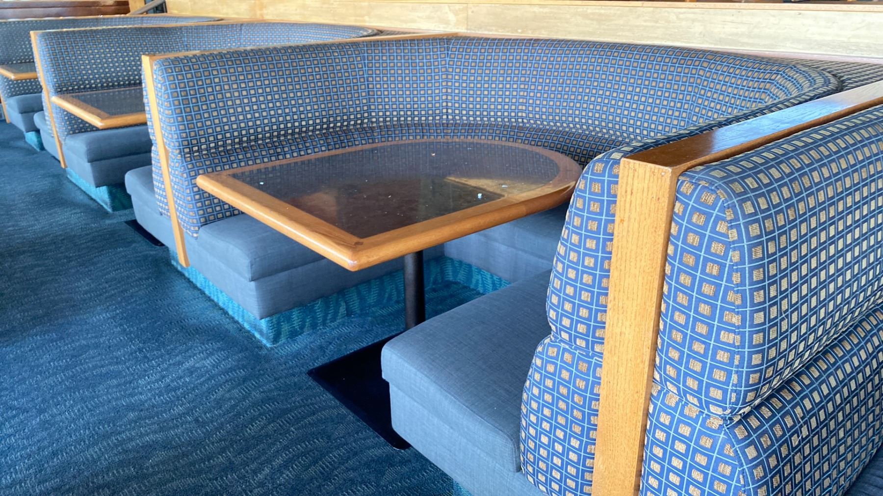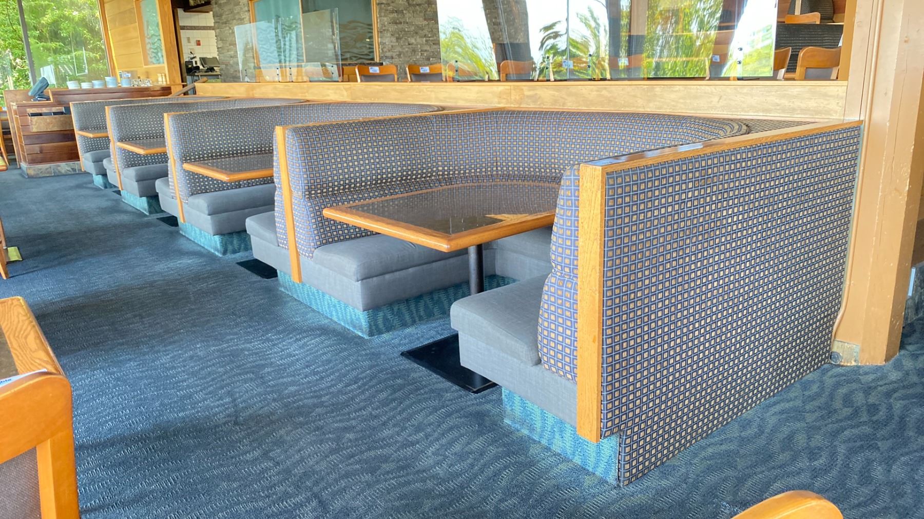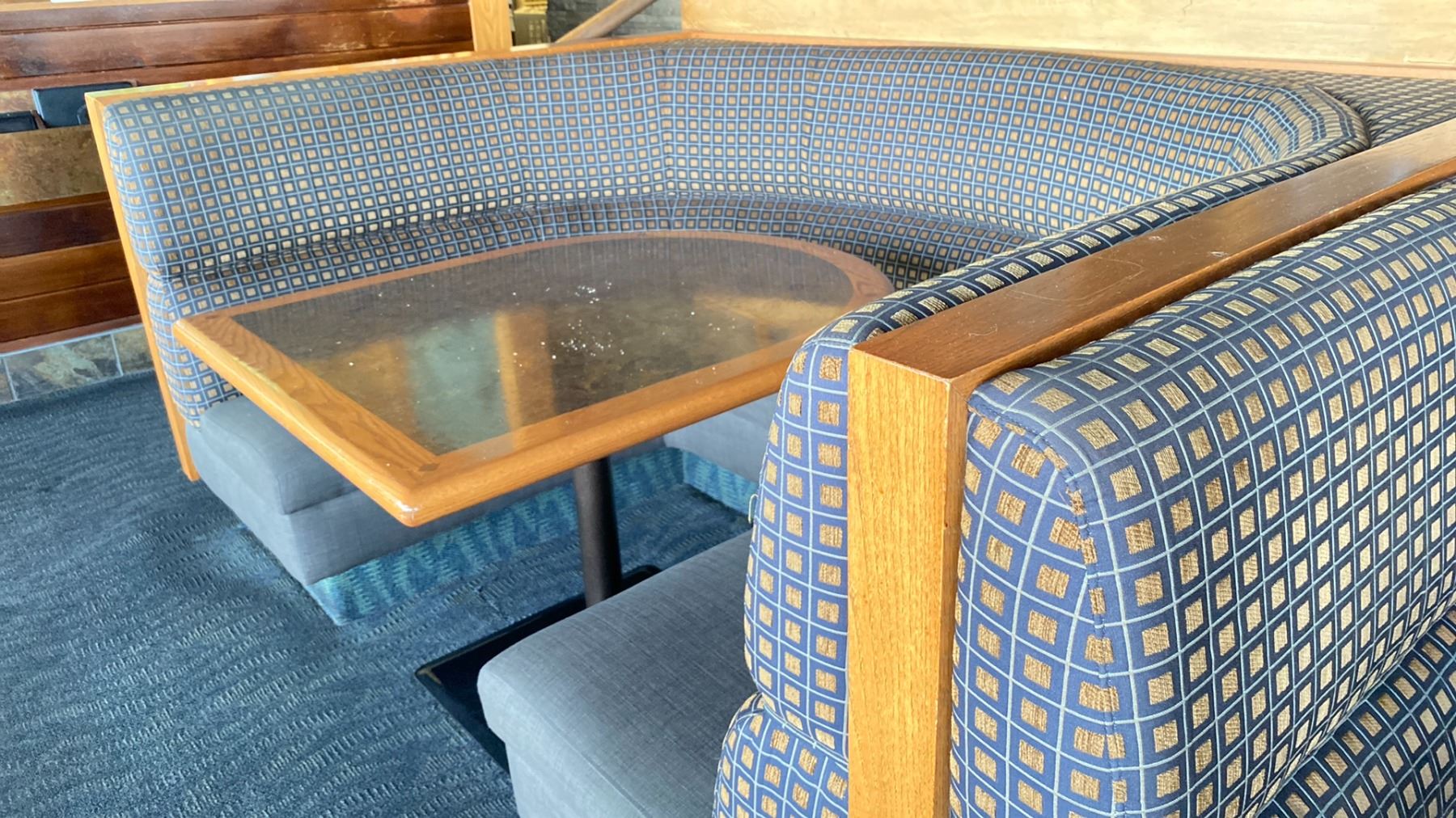 ROW OF MOUNTED HALF MOON RESTAURANT BOOTH SEATING BENCHES AND TABLES *TO BE DISMANTLED, REQUIRES TOOLS & HELP FOR REMOVAL*