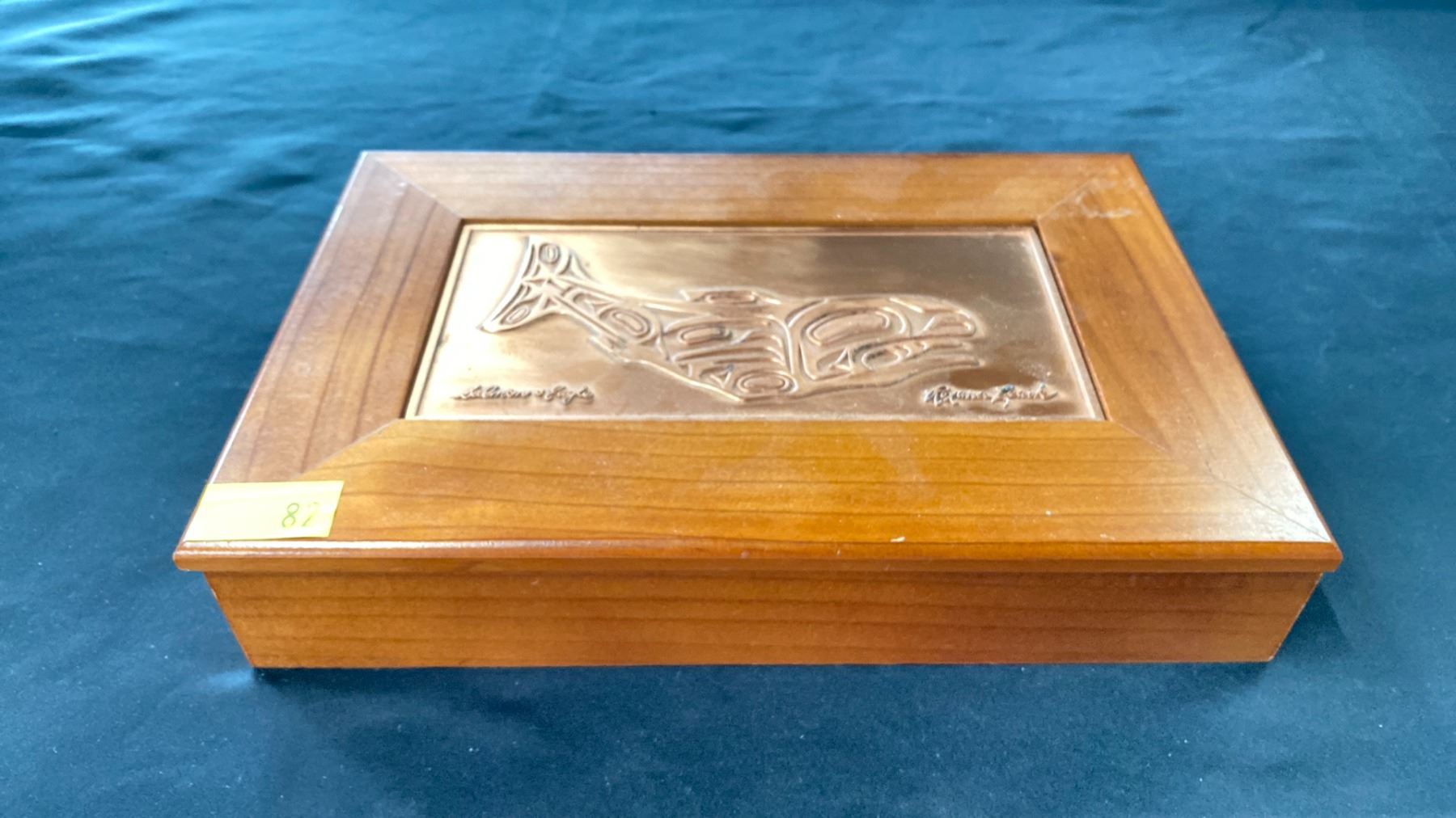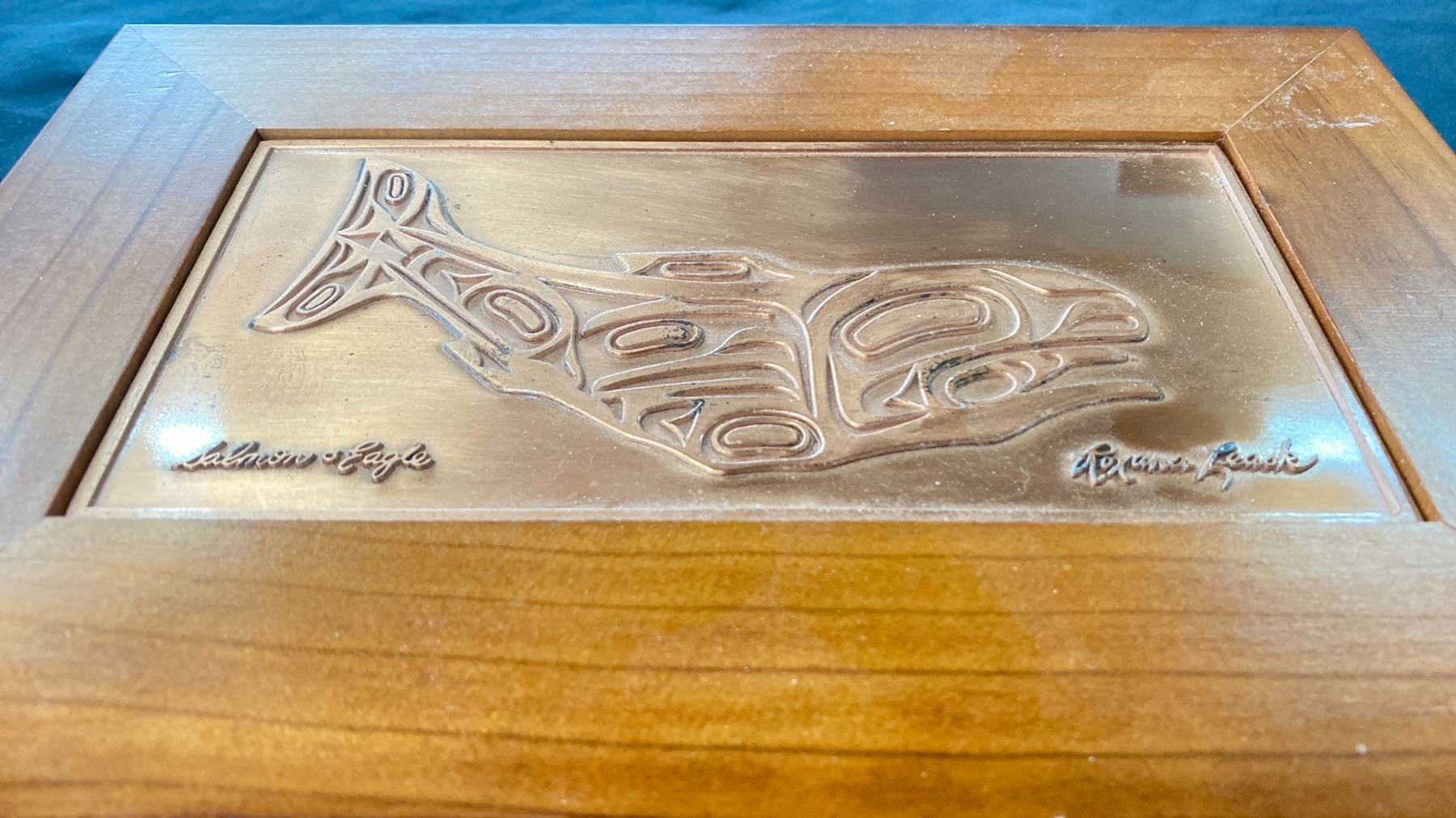 ROXANA LEASK "SALMON & EAGLE" COPPER AND WOOD WEST COAST FIRST NATIONS LIDDED KEEPSAKE BOX