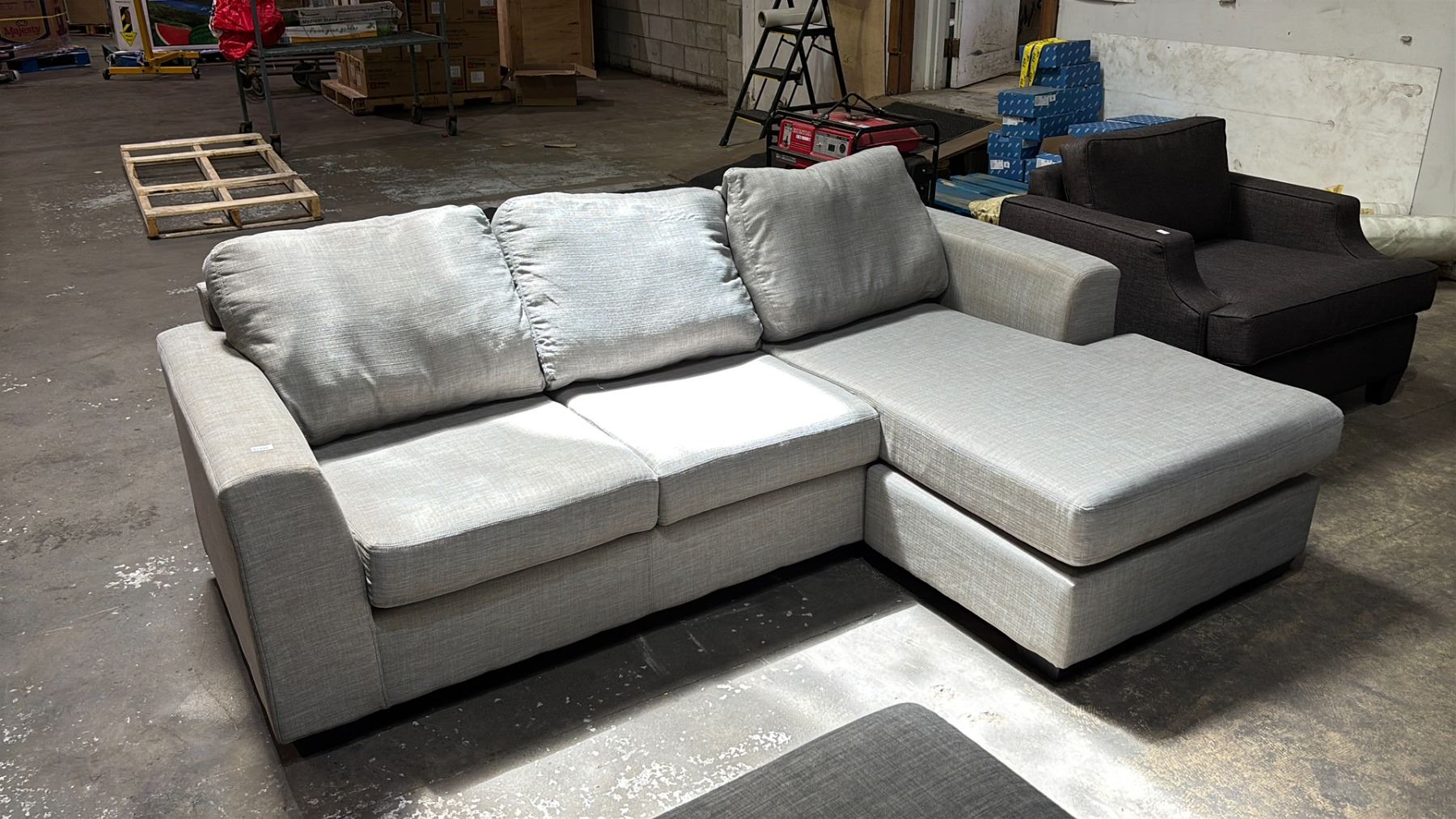 ROYAL FURNITURE SECTIONAL REVERSIBLE CHAISE CANADIAN MADE. 86.25L X 33.75W X 28H , CHAISE: 60L DIRT STAIN ON LEFT ARM