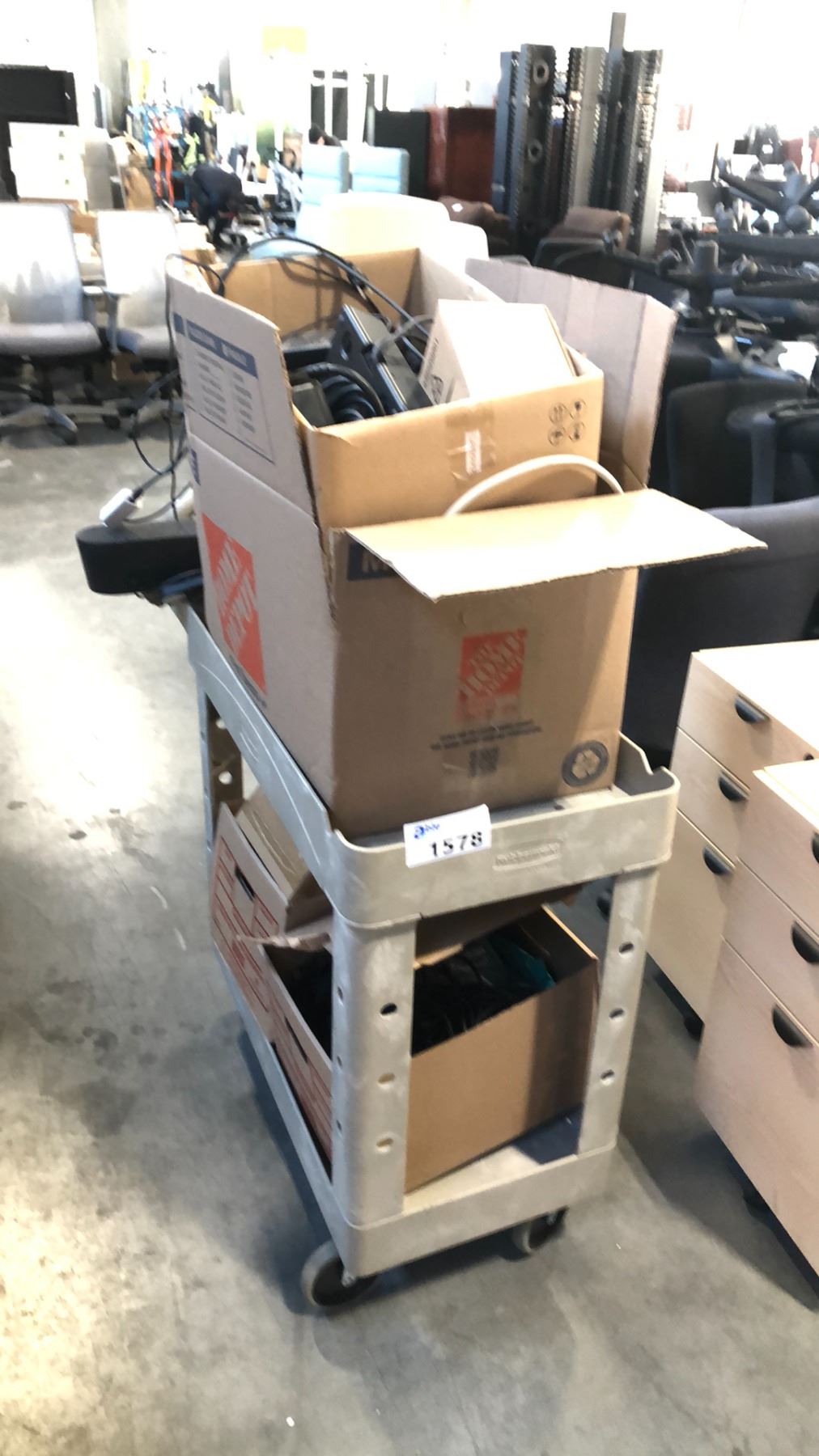 RUBBERMAID CART WITH CONTENTS INCLUDING MISC CABLES AND MORE