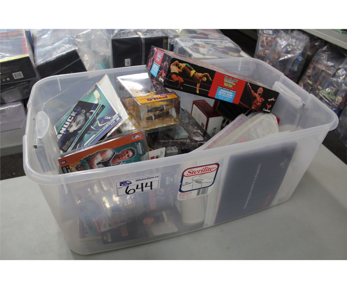 RUBBERMAID CONTAINER WITH MISCELLANEOUS SPORTS COLLECTABLES