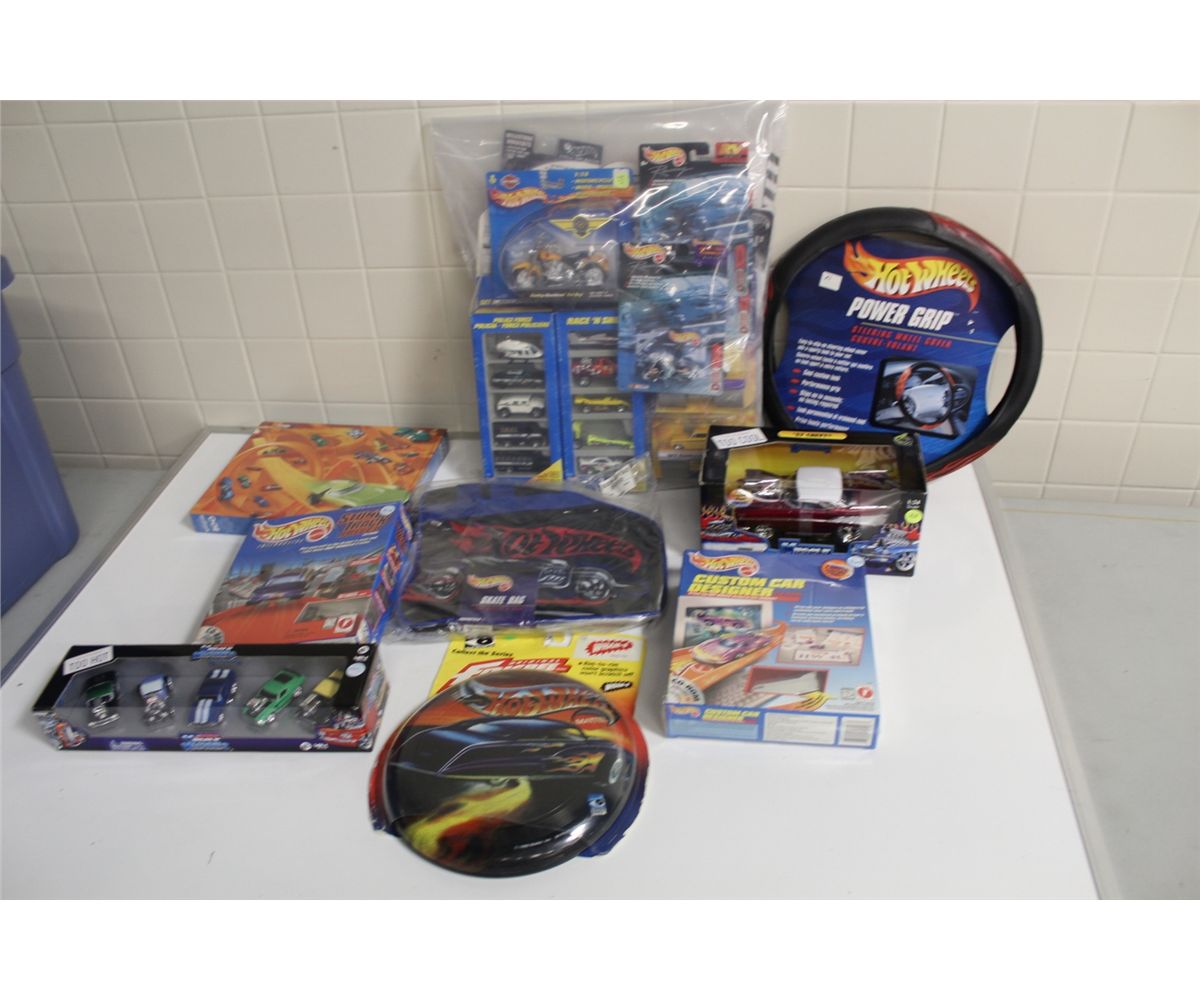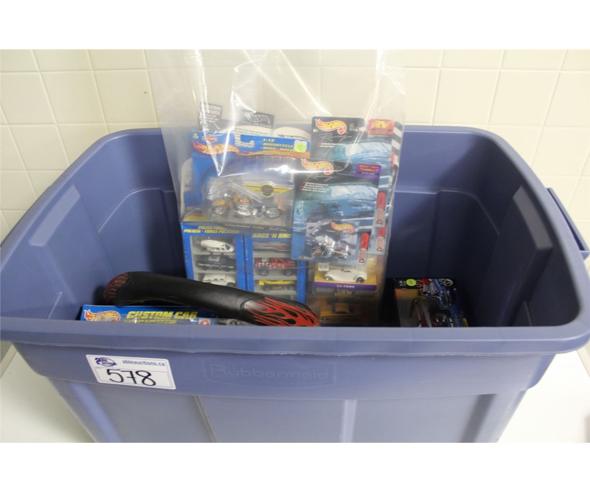 RUBBERMAID CONTAINING ASSORTED HOT WHEELS COLLECTABLES INCLUDING STEERING WHEEL COVER, FRISBEE, DIE-CAST, SKATE BAG AND MORE!