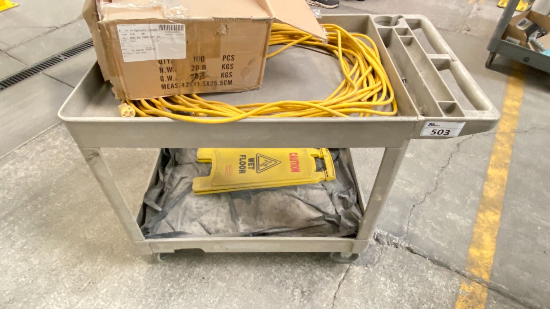 RUBBERMAID ROLLING CART 48X25  NO CONTENTS WITH CRACKED HANDLE
