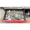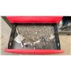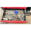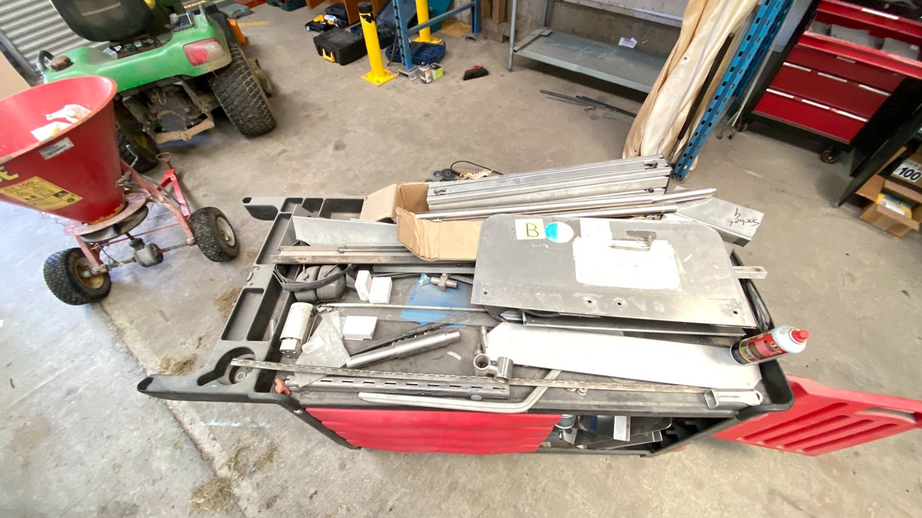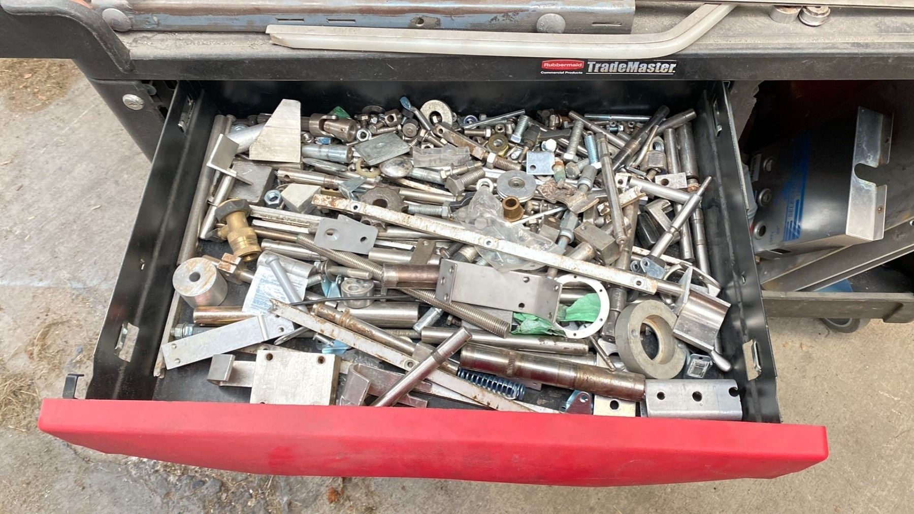 RUBBERMAID TRADEMASTER TOOL CART 60"X27" ON WHEELS WITH CONTENTS. MOSTLY SCRAP MUCH OF IT STAINLESS