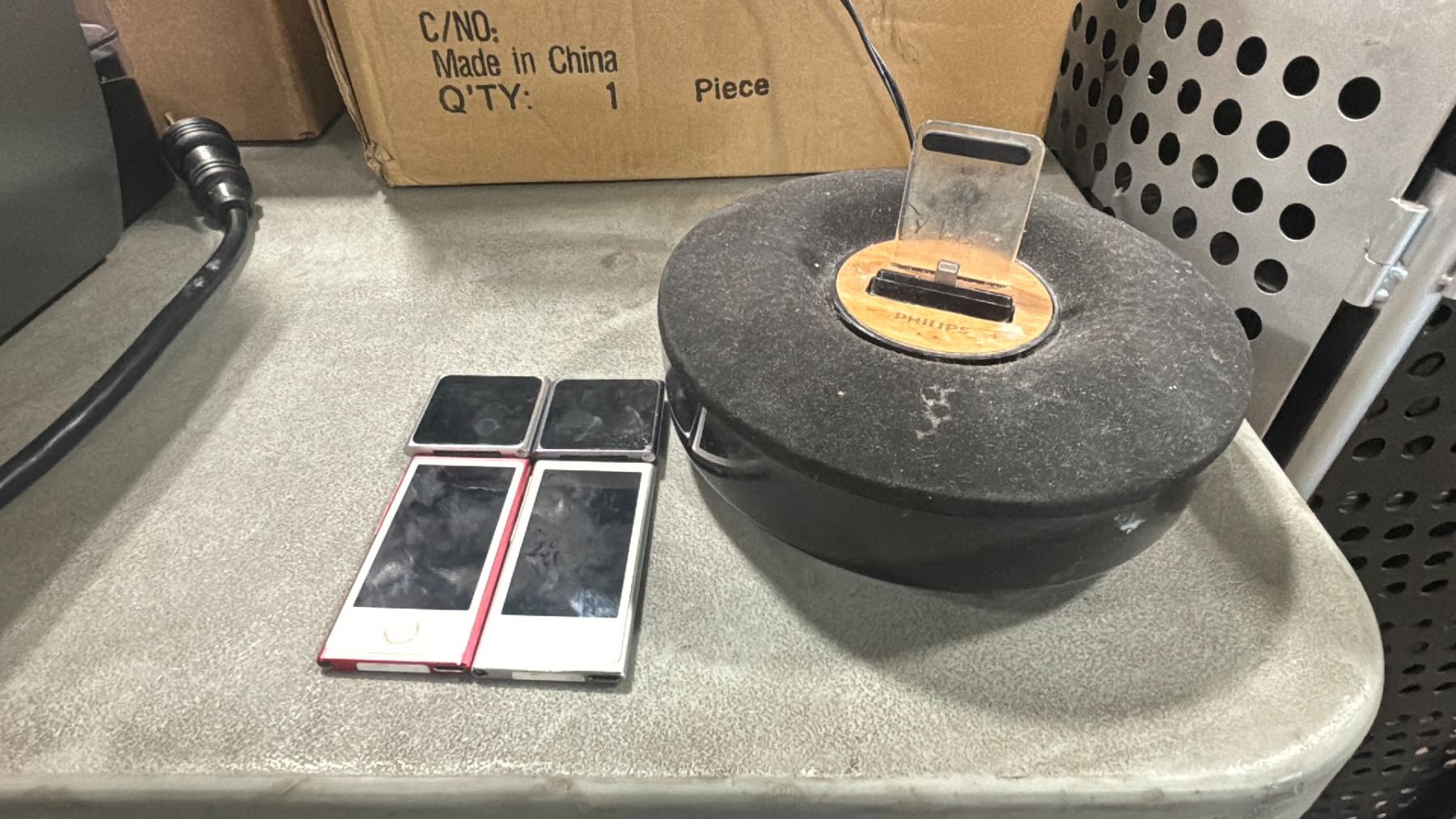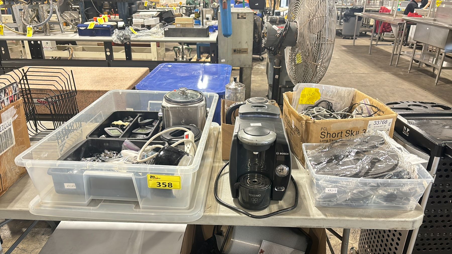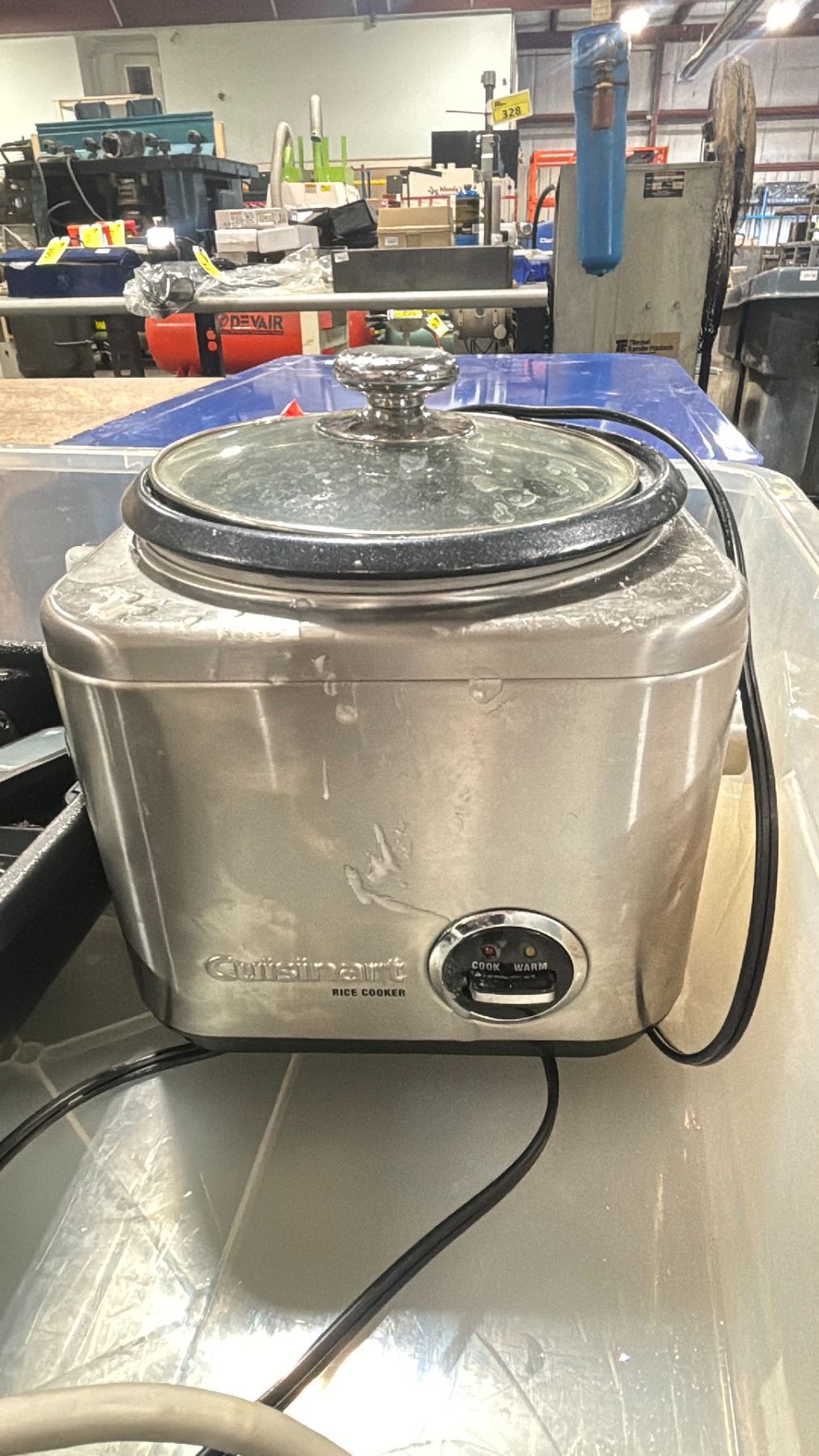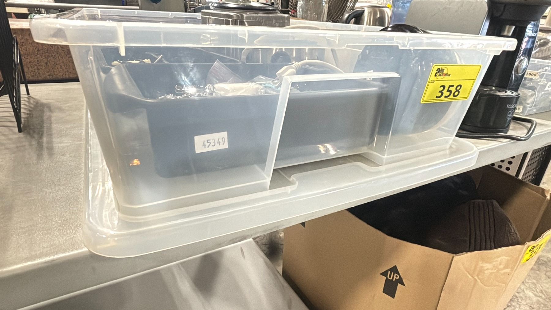 RUSSELL HOBBS STAINLESS STEEL ELECTRIC KETTLE, BOSCH TASSIMO SINGLE SERVE COFFEE MAKER, CUISINART STAINLESS STEEL RICE COOKER, 2 SUGAR DISPENSERS, 2 IPOD NANOS, 2 IPOD SHUFFLES, 2 PHILLIPS DOCKS, TIMERS, ASSORTED POWER CORDS, POWER BAR, A 31"W X 22"D X 8"H PLASTIC STORAGE TOTE WITH LID & A BOX WITH 2 FLEECE BLANKETS