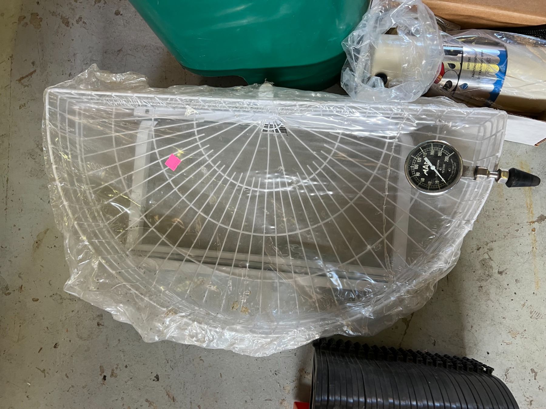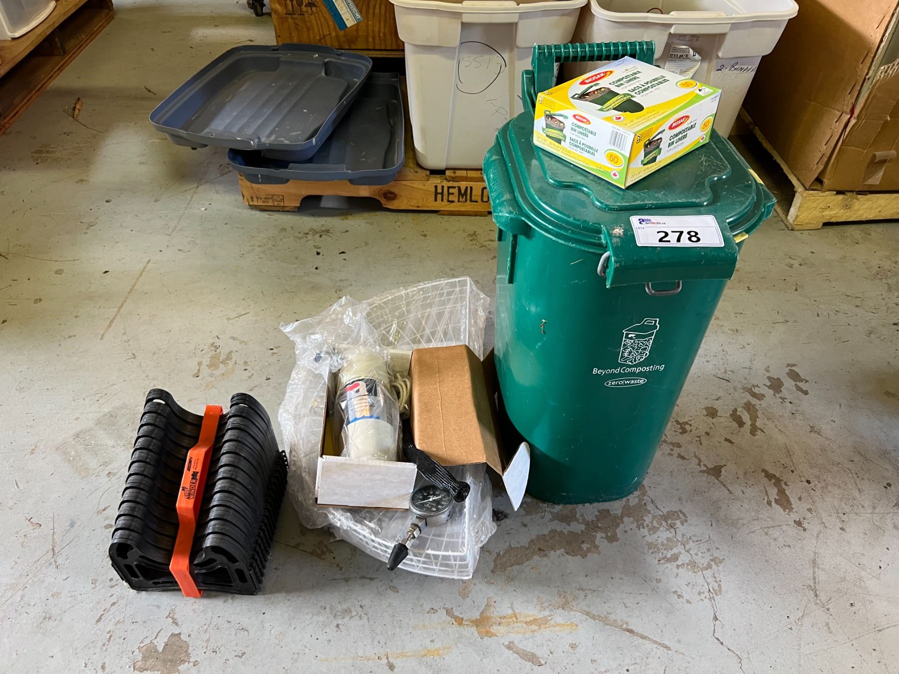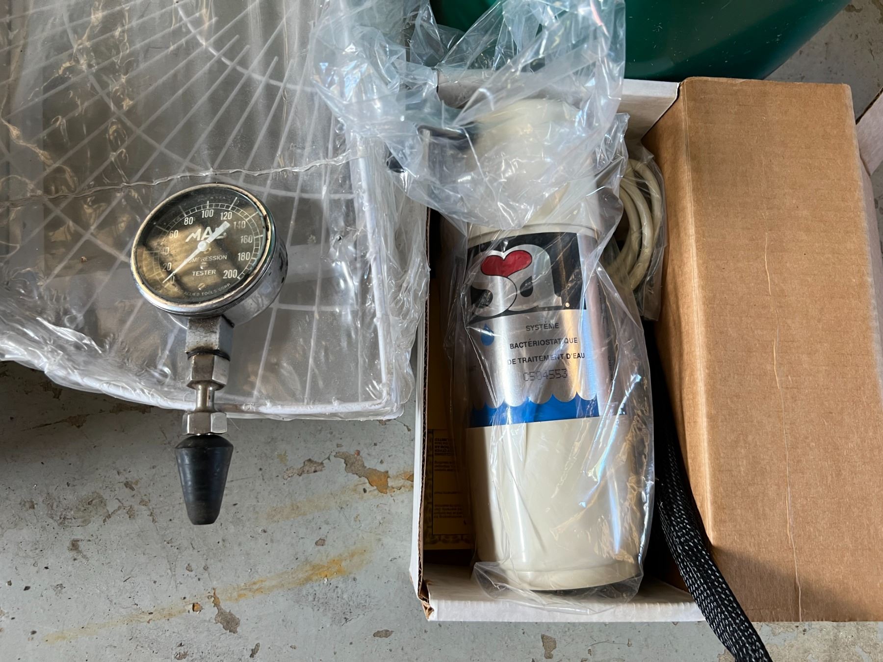 RV BIWONDER WASTE WATER SUPPORT & NSA WATER FILTER MAC COMPRESSOR TESTER & COMPOST BIN WITH BOX OF LINER