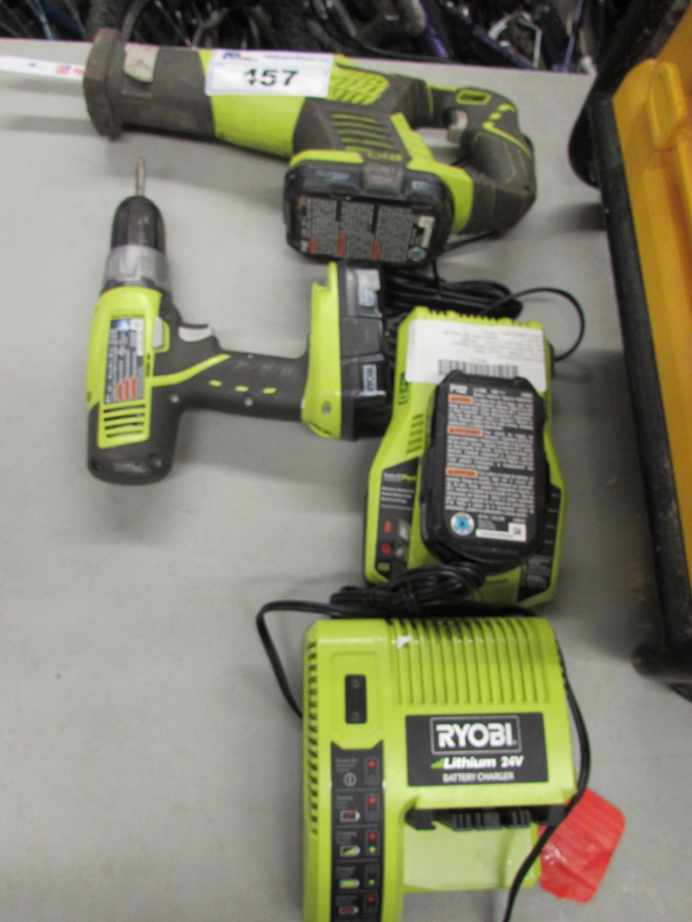 RYOBI 18V LITHIUM DRILL, RYOB 18V LITHIUM SAWZALL, 2 RYOBI CHARGERS & BATTERIES