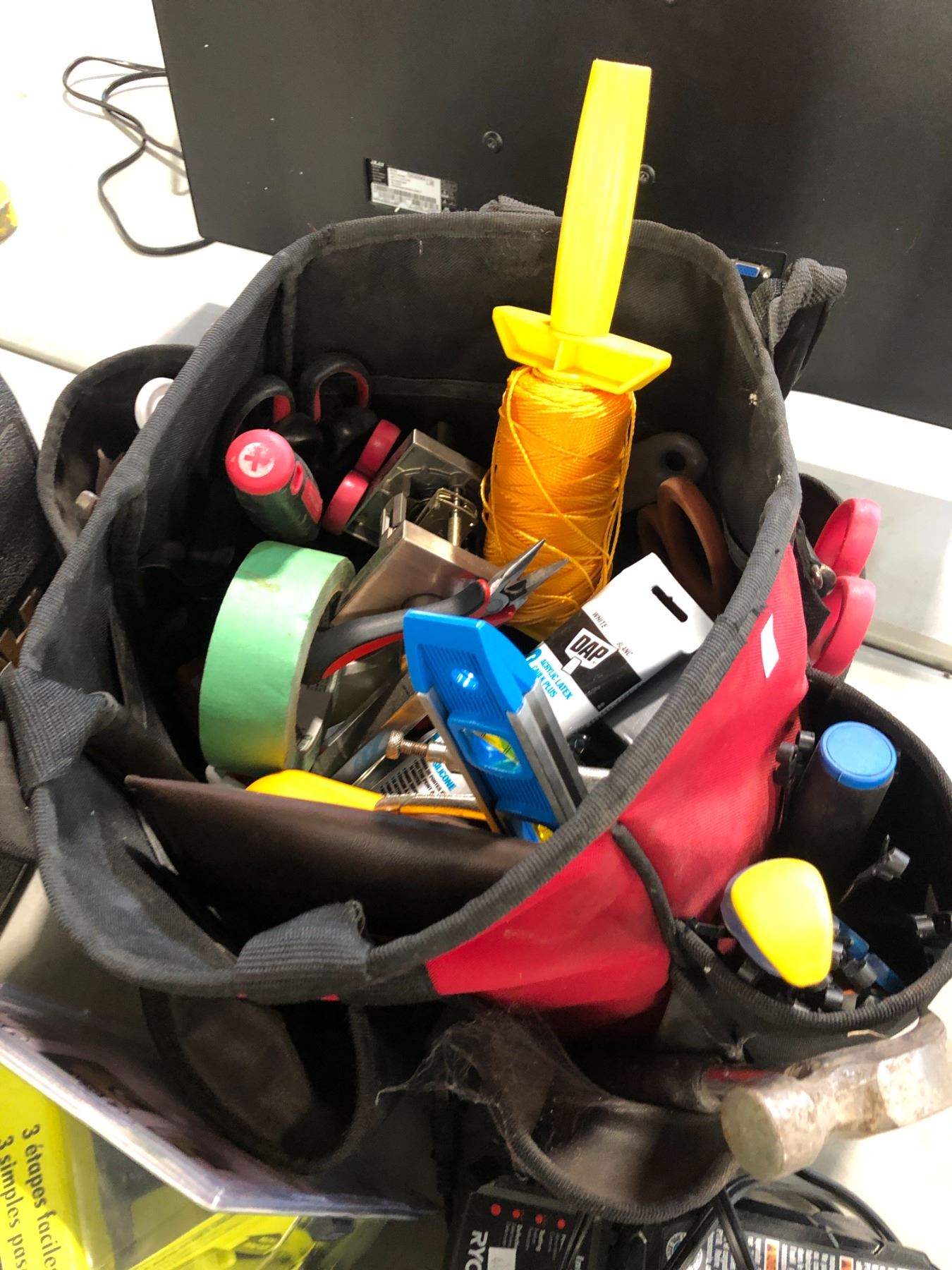 RYOBI 18V ONE+ HP BRUSHLESS CORDLESS COMPACT CUT-OFF TOOL, P271 DRILL DRIVER POWER TOOLS INCLUDING RYOBI WOOD/METAL DOOR LOCK INSTALLATION SET, RYOBI INTELLIPORT 18V CHARGER, 2 DEAD BOLTS, BOSTITCH SB 2IN1 AIR GUN AND TOOL BAG WITH MISC HAND TOOLS