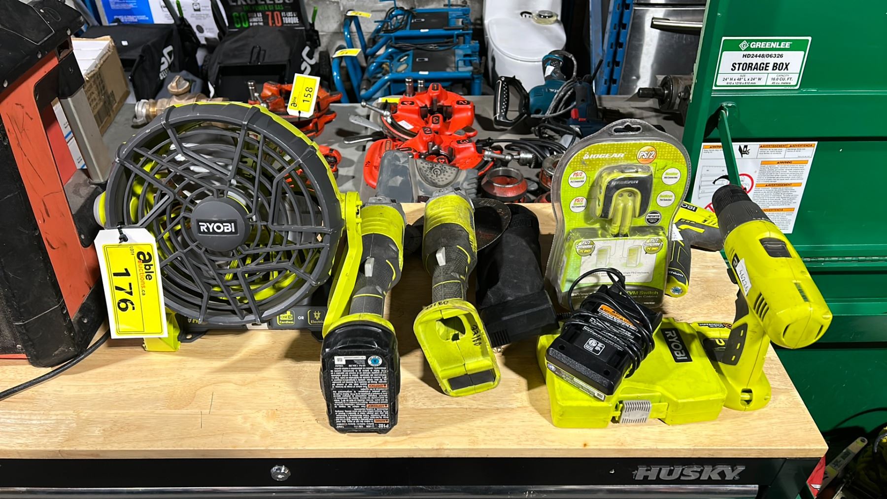 RYOBI CORDLESS TOOLS INCLUDING FRESH AIR FAN, 2 ANGLE GRINDERS *ONE WITH BATTERY*, 2 DRILLS *ONE WITH BATTERY*, BATTERY CHARGER, BIT SET & IOGEAR DUAL COMPUTER CONTROL