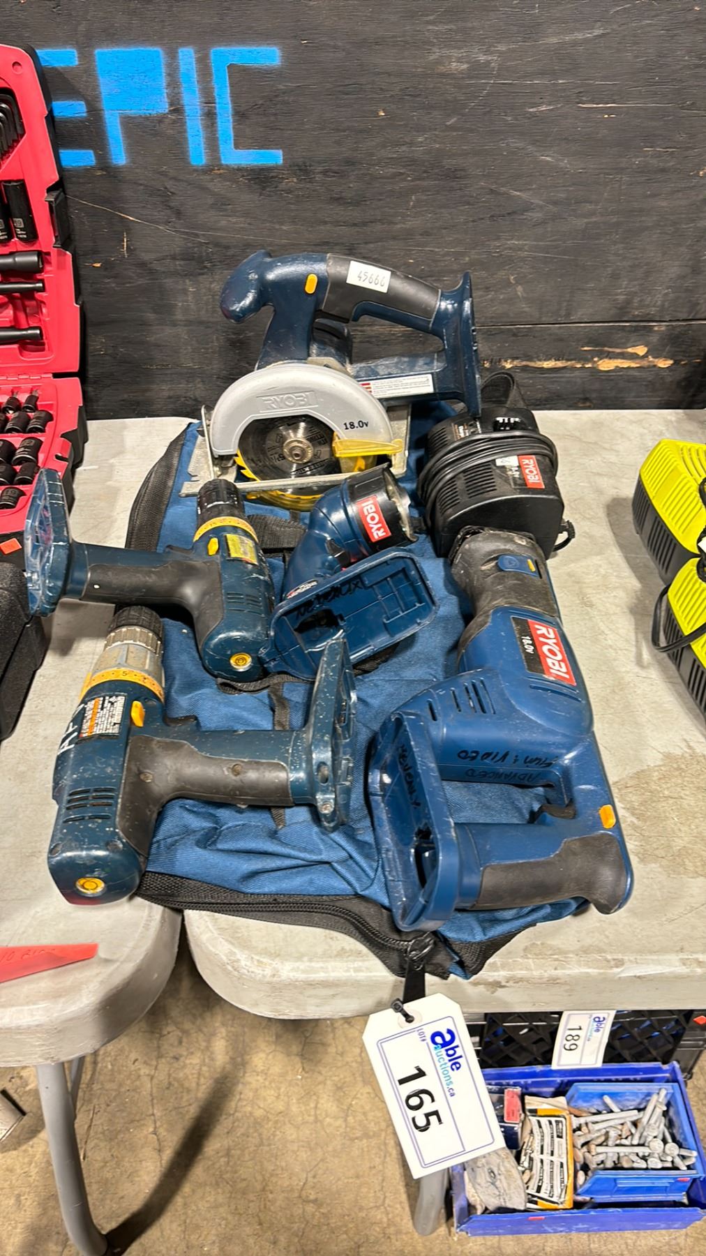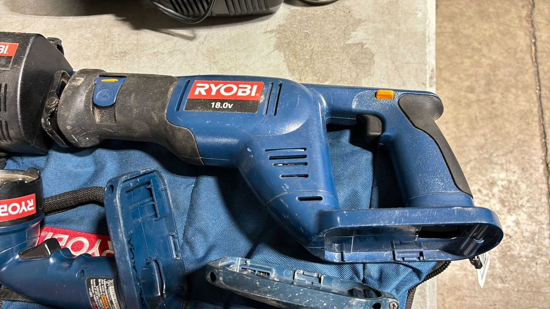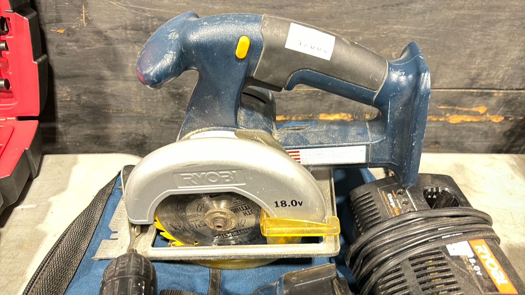 RYOBI R10631 CIRCULAR SAW *NO BATTERY*, RYOBI HP1802M & RYOBI P200 DRILL *NO BATTERIES*, RYOBI P700 18V FLASHLIGHT *NO BATTERY*, RYOBI P510 RECIPROCATING SAW *NO BATTERY*, RYOBI 18V CHARGER & A RYOBI SOFT TRANSPORT BAG